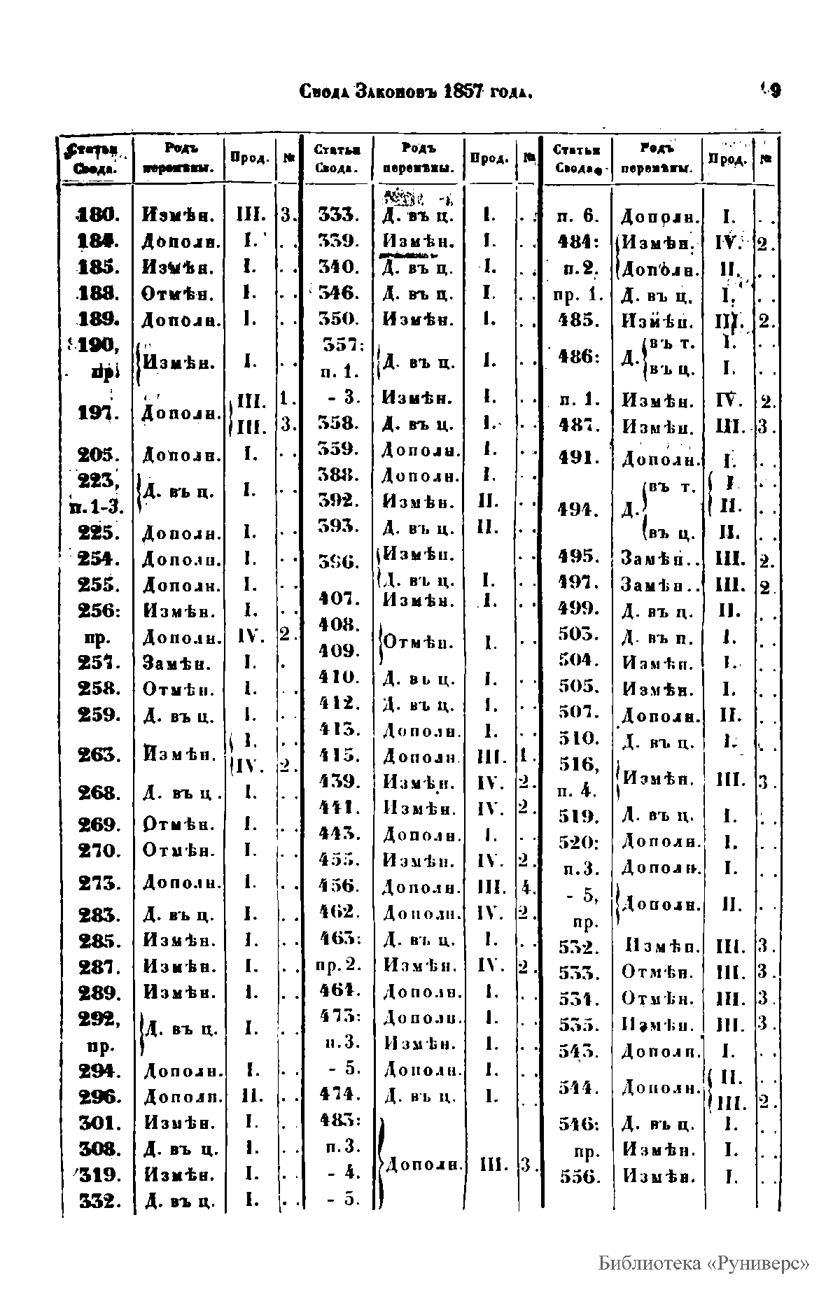 Свод законов Российской империи— официальное собрание расположенных в тематическом порядке действующих законодательных актов Российской империи, созданное при Николае I. Впервые он был напечатан в 1832 году. Манифестом 31 января 1833 года Свод законов был объявлен действующим источником права с 1 января 1835 года. Первое издание 1832 года и последующие 1842-го и 1857 года состояли из пятнадцати томов. После 1857 года Свод законов полностью не переиздавался, а выходили лишь отдельные тома. В качестве отдельного – 16-го тома в 1885 году вышли Судебные уставы. Между изданиями Свода законов выходили ежегодные и сводные (за несколько лет) «Продолжения» Свода законов с указанием на упраздненные и измененные статьи. В своде законов собраны все реально действовавшие в определенный момент времени законы по тем или иным проблемам права, это справочник для юристов. Отбор законодательного материала для включения в Свод производился на основе Полного собрания законов (первое Полное собрание законов, появившееся в 1830 году, состояло из 45 томов, содержащих 30 920 актов и 6 томов приложений). Собрание законов – это в большой степени историческое издание. По нему можно изучать развитие, направление правительственной мысли в стране. Это летопись отечественного законотворчества. Изучая страницу за страницей эту летопись, мы можем узнать, что в тот или иной момент истории являлось злобой дня.