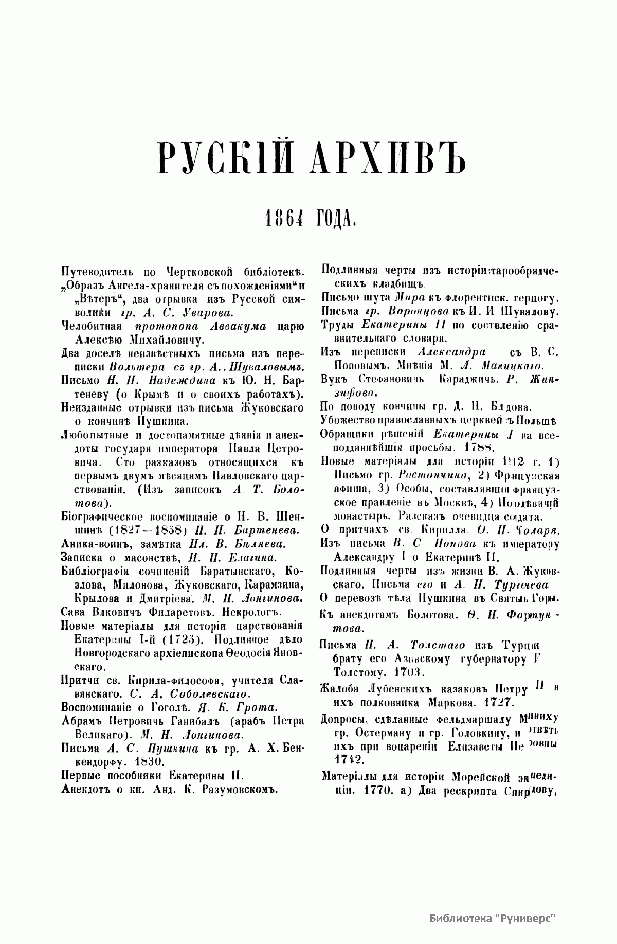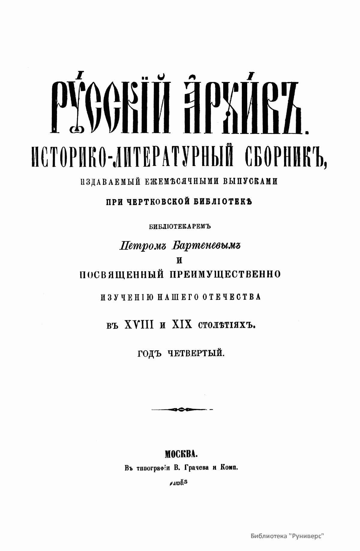 «Русский архив» — ежемесячный историко-литературный журнал, издававшийся в Москве с 1863 по 1917 год. Создателем и продолжительные годы редактором журнала был П. И. Бартенев – историк, археограф, библиограф. Этот журнал называли «живой картиной былого», поскольку он содержал преимущественно публикации неизданных мемуарных, эпистолярных, литературно-художественных и ведомственных документальных материалов, освещавших культурную и политическую историю России в XVIII и XIX вв. По числу опубликованных источников «Русский архив» стоит на первом месте среди русских исторических журналов.