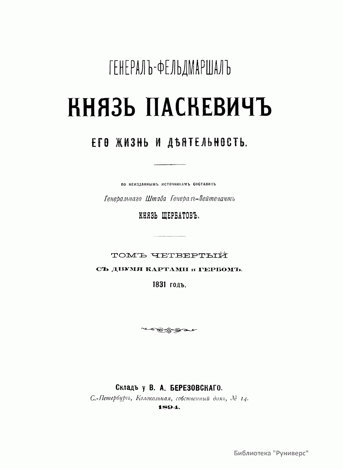 Данное издание князя Александра Петровича Щербатова (1836– ? ) представляет собой полное жизнеописание Ивана Федоровича Паскевича (1782–1856) — графа Эриванского (1828), светлейшего князя Варшавского (1831), видного российского военного и государственного деятеля. Иван Федорович Паскевич участвовал в русско-турецкой войне 1806–1812 гг. Во время Отечественной войны 1812 г. и заграничных походов 1813–1814 гг. командовал дивизией. В 1817–1819 гг. состоял при великом князе Михаиле Павловиче, затем командовал гвардейской пехотной дивизией, в которой служил будущий император Николай I, что способствовало быстрой карьере Паскевича, ставшего одним из наиболее близких к Николаю I лиц. Был членом Верховного суда по делу декабристов. С 1826 г. командовал войсками в Закавказье, в марте 1827 г. стал наместником на Кавказе. Во время русско-иранской и русско-турецкой войн был главнокомандующим войсками на Кавказском театре военных действий. Руководил подавлением Польского восстания 1830–1831 гг., после чего был назначен наместником Царства Польского, проводил политику национального угнетения и русификации. В 1849 г. командовал войсками при подавлении Венгерской революции (1848–1849). Во время Крымской войны (1853–1856) был главнокомандующим войсками на западных границах и на Дунае. Этот капитальный труд, основанный на подлинных архивных документах, иллюстрируют планы сражений и карты театров военных действий, в которых принимал участие И. Ф. Паскевич.