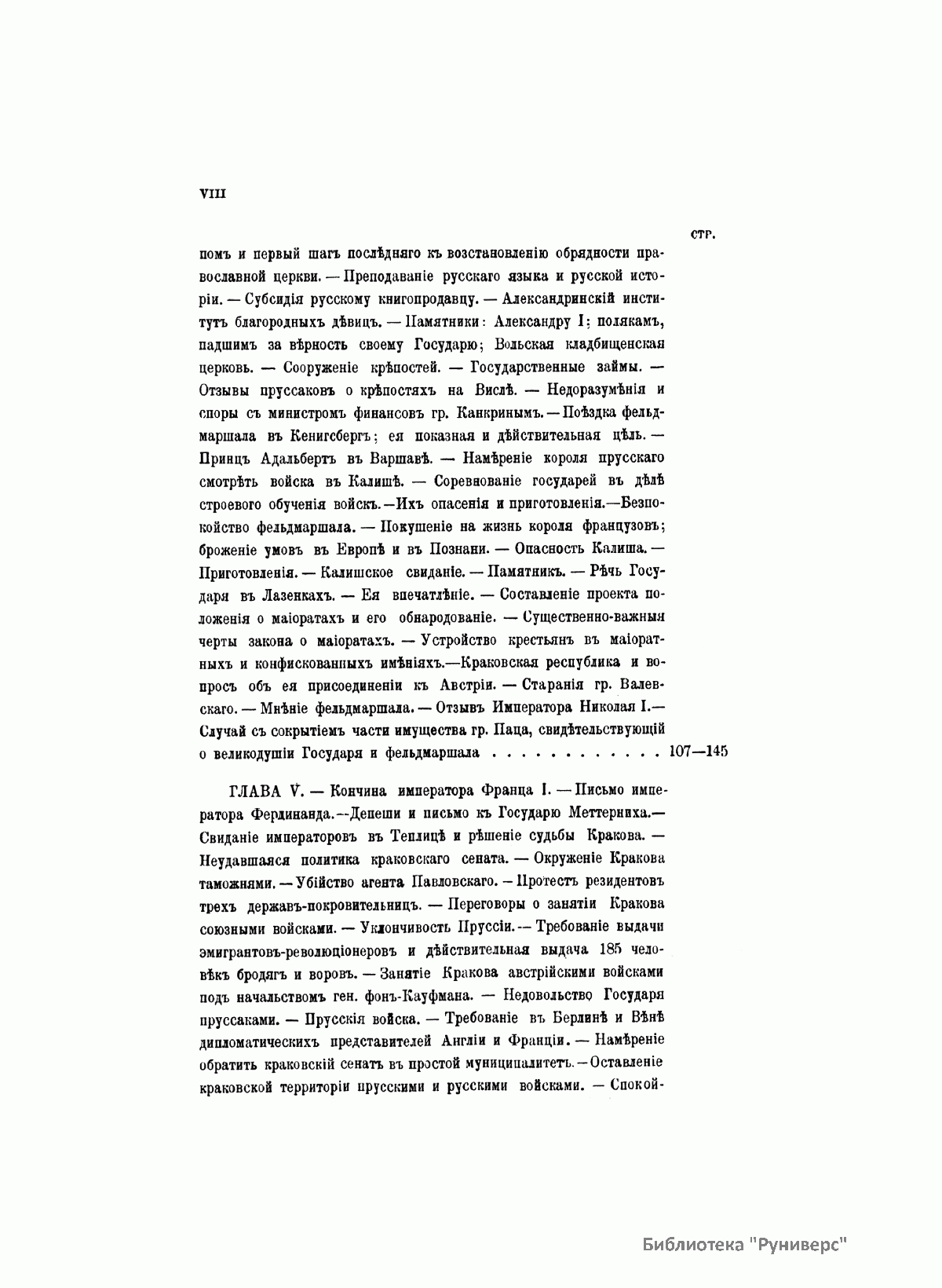 Данное издание князя Александра Петровича Щербатова (1836– ? ) представляет собой полное жизнеописание Ивана Федоровича Паскевича (1782–1856) — графа Эриванского (1828), светлейшего князя Варшавского (1831), видного российского военного и государственного деятеля. Иван Федорович Паскевич участвовал в русско-турецкой войне 1806–1812 гг. Во время Отечественной войны 1812 г. и заграничных походов 1813–1814 гг. командовал дивизией. В 1817–1819 гг. состоял при великом князе Михаиле Павловиче, затем командовал гвардейской пехотной дивизией, в которой служил будущий император Николай I, что способствовало быстрой карьере Паскевича, ставшего одним из наиболее близких к Николаю I лиц. Был членом Верховного суда по делу декабристов. С 1826 г. командовал войсками в Закавказье, в марте 1827 г. стал наместником на Кавказе. Во время русско-иранской и русско-турецкой войн был главнокомандующим войсками на Кавказском театре военных действий. Руководил подавлением Польского восстания 1830–1831 гг., после чего был назначен наместником Царства Польского, проводил политику национального угнетения и русификации. В 1849 г. командовал войсками при подавлении Венгерской революции (1848–1849). Во время Крымской войны (1853–1856) был главнокомандующим войсками на западных границах и на Дунае. Этот капитальный труд, основанный на подлинных архивных документах, иллюстрируют планы сражений и карты театров военных действий, в которых принимал участие И. Ф. Паскевич.