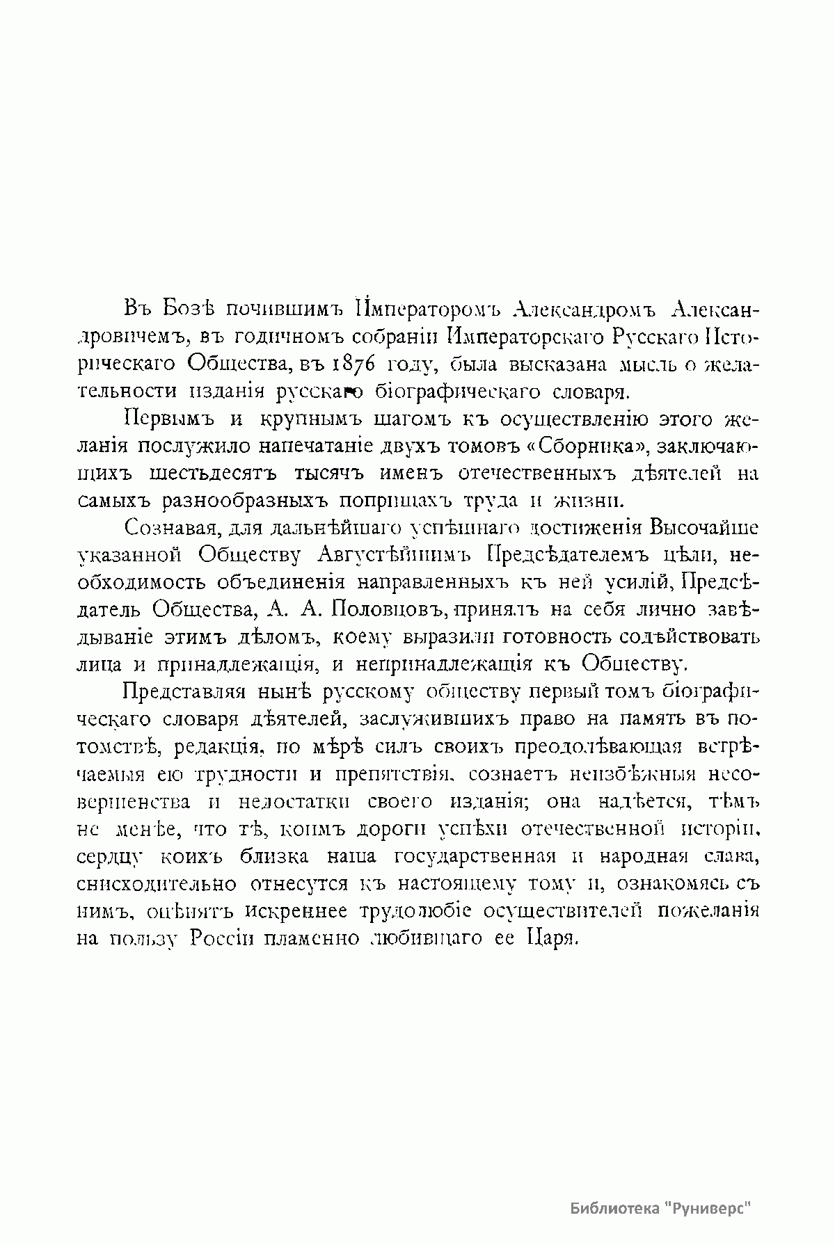 Русский биографический словарь (25 томов), в состав которого вошли имена и биографии виднейших деятелей государства, науки, просвещения и церковных деятелей, издавался Русским историческим обществом с 1896 по 1918 год. Русское историческое общество было основано в Санкт-Петербурге в 1866 году по инициативе известных отечественных историков, военных и государственных деятелей и ставило своей целью всесторонне содействовать развитию русского национального исторического просвещения. Общество пользовалось покровительством и финансовой поддержкой императорской семьи. Его деятельность носила археографический характер. Члены общества собирали исторические документы, которые публиковались в «Сборниках русского исторического общества». Всего до 1920 года (в этом году общество было закрыто) вышло 148 томов. Таким образом в научный оборот было введено большое количество документов XVIII – начала XIX века, ранее недоступных для исследователей, так как документальные материалы архивов царской России были для историков закрыты. К изданию русского биографического словаря, материалы которого до сих пор являются интереснейшим источником для исследователей, Общество приступило по инициативе императора Александра III. Тома биографического словаря выходили не в алфавитном порядке. С 1896 по 1909 год редактором словаря был руководитель Русского исторического общества, промышленник, член Сената Александр Александрович Половцев. Он выпустил 1, 2, 3, 6, 8, 12, 13, 14, 15, 18, 19, 21 и 22-й тома, поэтому этот словарь известен еще как «словарь Половцева».