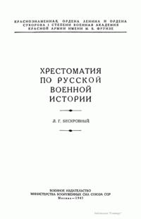 Хрестоматия представляет собой сборник военно-исторических документов. Каждая глава содержит документальный материал (отрывки из летописей, уставов, приказы, диспозиции, инструкции, письма и т.д.), относящиеся к определенному военно-историческому периоду. Этот материал, по замыслу составителя, подобран так, чтобы языком документов рассказать о войнах, которые пришлось вести русскому народу, чтобы дать представление о деятельности наших великих полководцев, показать состояние вооруженных сил страны в тот или иной период, их организацию, чтобы проследить развитие русского военного искусства. Всего в сборнике 14 глав, охватывающих X-XIX вв. и начало XX в. Для облегчения работы над документами допетровской эпохи они даны в переведенном виде. В этих целях к хрестоматии прилагается словарь военно-исторических терминов. Карты и схемы пл курсу русской военной истории издаются отдельной книгой. Часть документов дана в сокращенном виде. Во всех документах сохранено начертание имен собственных, принятое в подлинниках, причем различие в этом отношении между документами не оговаривается. Периодизация, принятая в хрестоматии, совпадает с общеисторической. При подборе документов составитель стремился раскрыть основные черты нашей военной истории, без понимания которых невозможно формирование военной идеологии офицера Красной Армии. В подборе материалов по Северной войне 1700-1721 гг. (глава VII) и по 2-й русско-турецкой войне 1787-1791 гг. (глава X) принимал участие И.П. Першин.