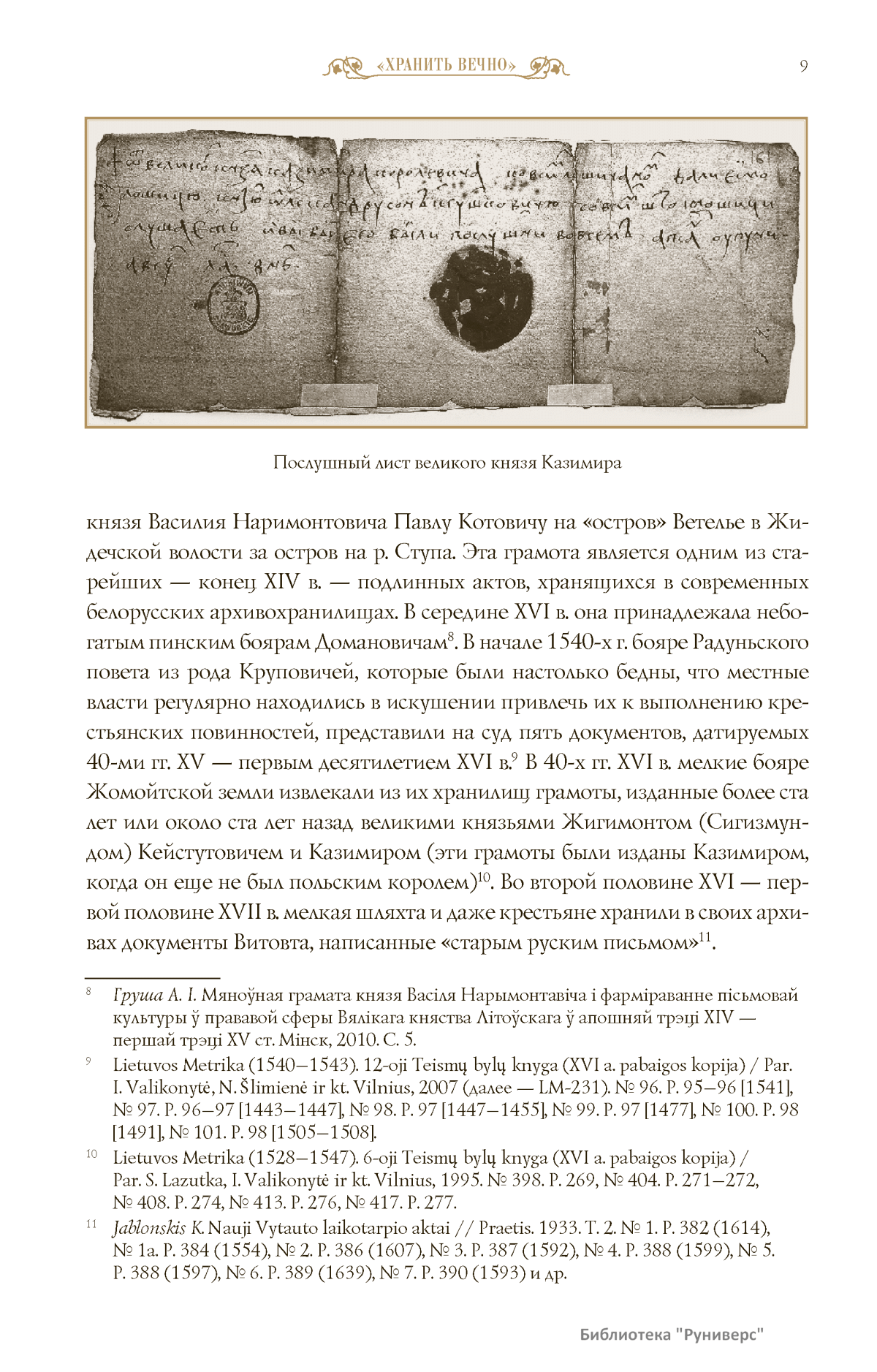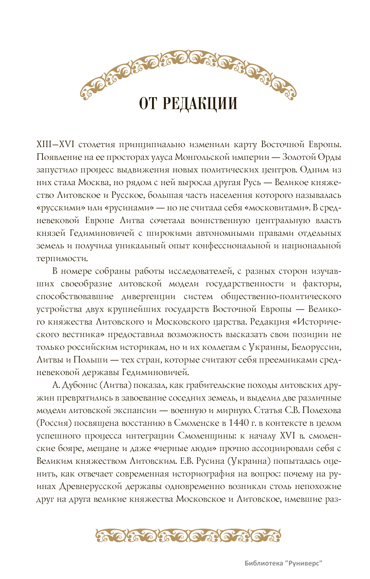 XIII–XVI столетия принципиально изменили карту Восточной Европы. Появление на ее просторах улуса Монгольской империи — Золотой Орды запустило процесс выдвижения новых политических центров. Одним из них стала Москва, но рядом с ней выросла другая Русь — Великое княжество Литовское и Русское, большая часть населения которого называлась «русскими» или «русинами» — но не считала себя «московитами». В средневековой Европе Литва сочетала воинственную центральную власть князей Гедиминовичей с широкими автономными правами отдельных земель и получила уникальный опыт конфессиональной и национальной терпимости. В номере собраны работы исследователей, с разных сторон изучав-ших своеобразие литовской модели государственности и факторы, способствовавшие дивергенции систем общественно-политического устройства двух крупнейших государств Восточной Европы — Великого княжества Литовского и Московского царства. Редакция «Исторического вестника» предоставила возможность высказать свои позиции не только российским историкам, но и их коллегам с Украины, Белоруссии, Литвы и Польши — тех стран, которые считают себя преемниками средневековой державы Гедиминовичей. А. Дубонис (Литва) показал, как грабительские походы литовских дружин превратились в завоевание соседних земель, и выделил две различные модели литовской экспансии — военную и мирную. Статья С.В. Полехова (Россия) посвящена восстанию в Смоленске в 1440 г. в контексте в целом успешного процесса интеграции Смоленщины: к началу XVI в. смоленские бояре, мещане и даже «черные люди» прочно ассоциировали себя с Великим княжеством Литовским. Е.В. Русина (Украина) попыталась оценить, как отвечает современная историография на вопрос: почему на руинах Древнерусской державы одновременно возникли столь непохожие друг на друга великие княжества Московское и Литовское, имевшие разную логику исторического развития? Д. Шульц и Р. Яворский (Польша) представили обзор трудов польских историков, посвященных ключевым в польско-литовских отношениях событиям — Кревскому акту 1385 г. и Люблинской унии 1569 г. А.И. Груша (Белоруссия) постарался обобщить сведения и выявить специфику (децентрализацию и подвижность) различных видов архивов Великого княжества Литовского, рассеянных ныне по архивохранилищам нескольких государств. А.В. Казаков (Белоруссия) проследил судьбу московского выходца XVI века И.Т. Юрлова, чей жизненный путь можно считать примером успешной интеграции эмигранта в социум Великого княжества Литовского в условиях благоприятного для москвичей «социокультурного климата» этого государства. В.А. Воронин (Белоруссия) оценил, как развивались отношения между католиками и православными в Великом княжестве в конце XIV — середине XVI в., и показал, что католической элите не удалось добиться абсолютного превосходства. До серьезных конфликтов на религиозной почве дело не доходило — в обществе были выработаны эффективные механизмы разрешения возникавших на конфессиональной почве противоречий. Д. Шульц (Польша) изучил влияние московско-литовских войн на процесс объединения Великого княжества с королевством Польским. Завершает номер рецензия С.В. Полехова на последнее издание документов Городельской унии Литвы и Польши 1413 г., посвящённая оценке реальных мер, направленных на интеграцию восточ