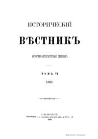 «Исторический вестник» - русский ежемесячный историко-литературный журнал. Издавался в Санкт-Петербурге с 1880-го по 1917 г. Журнал был основан А.С. Сувориным и С.Н. Шубинским с целью «знакомить читателей в живой, общедоступной форме с современным состоянием исторической науки и литературы в России и Европе». Вышло 150 тт. Каждый том состоял из трёх ежемесячных выпусков, имел свою нумерацию страниц, оглавление, список иллюстраций. Журнал приобрёл устойчивую популярность среди читателей, заняв прочное место в «триумвирате» русских исторических журналов наряду с «Русским архивом» и «Русской стариной». опережая их по количеству подписчиков. Отличием «Исторического вестника» было то, что он не помещал на своих страницах необработанных, сырых материалов. С другой стороны, журнал приближался по своему типу к журналам общелитературного образца, сочетая в себе коммерческий успех и доступное изложение материала.
