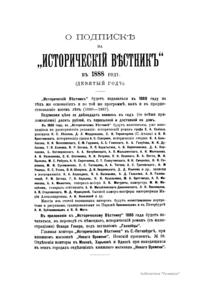 «Исторический вестник» - русский ежемесячный историко-литературный журнал. Издавался в Санкт-Петербурге с 1880-го по 1917 г. Журнал был основан А.С. Сувориным и С.Н. Шубинским с целью «знакомить читателей в живой, общедоступной форме с современным состоянием исторической науки и литературы в России и Европе». Вышло 150 тт. Каждый том состоял из трёх ежемесячных выпусков, имел свою нумерацию страниц, оглавление, список иллюстраций. Журнал приобрёл устойчивую популярность среди читателей, заняв прочное место в «триумвирате» русских исторических журналов наряду с «Русским архивом» и «Русской стариной». опережая их по количеству подписчиков. Отличием «Исторического вестника» было то, что он не помещал на своих страницах необработанных, сырых материалов. С другой стороны, журнал приближался по своему типу к журналам общелитературного образца, сочетая в себе коммерческий успех и доступное изложение материала.