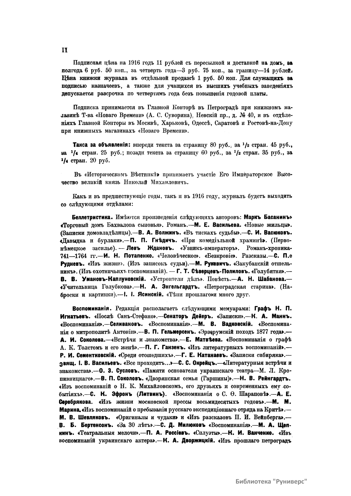 «Исторический вестник» - русский ежемесячный историко-литературный журнал. Издавался в Санкт-Петербурге с 1880-го по 1917 г. Журнал был основан А.С. Сувориным и С.Н. Шубинским с целью «знакомить читателей в живой, общедоступной форме с современным состоянием исторической науки и литературы в России и Европе». Вышло 150 тт. Каждый том состоял из трёх ежемесячных выпусков, имел свою нумерацию страниц, оглавление, список иллюстраций. Журнал приобрёл устойчивую популярность среди читателей, заняв прочное место в «триумвирате» русских исторических журналов наряду с «Русским архивом» и «Русской стариной». опережая их по количеству подписчиков. Отличием «Исторического вестника» было то, что он не помещал на своих страницах необработанных, сырых материалов. С другой стороны, журнал приближался по своему типу к журналам общелитературного образца, сочетая в себе коммерческий успех и доступное изложение материала.