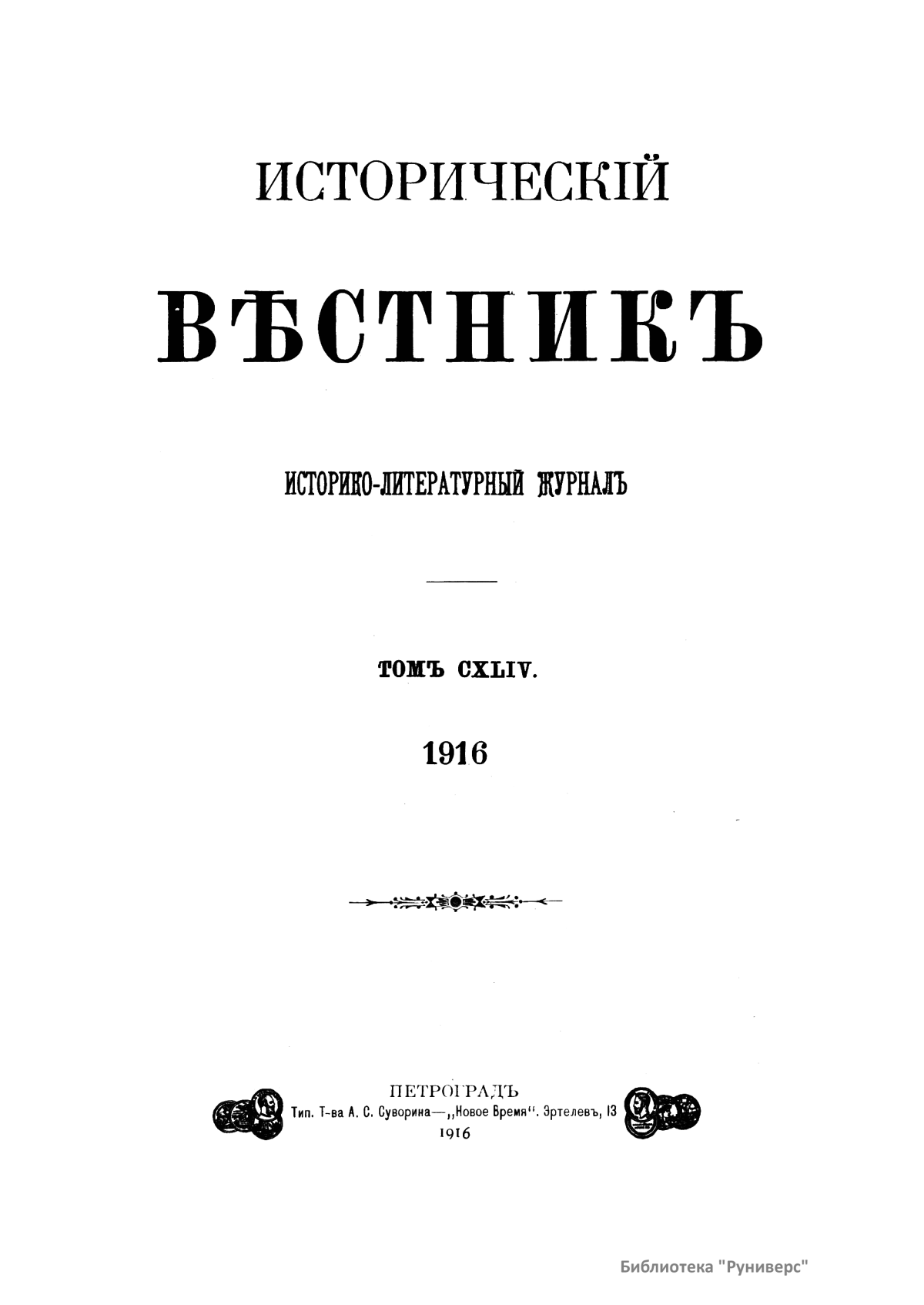 Исторический вестник. Историко-литературный журнал. Том CXLIV