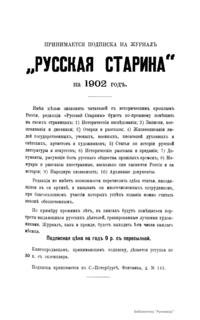«Русская старина», ежемесячный исторический журнал, выходил в Петербурге в 1870-1918. Основан, издавался и редактировался (1870-1892) М. И. Семевским при участии В. И. Семевского. Последующими редакторами были Н. К. Шильдер (1892-1896), Н. Ф. Дубровин (1896-1904), военные историки С. П. Зыков, П. Н. Воронов.