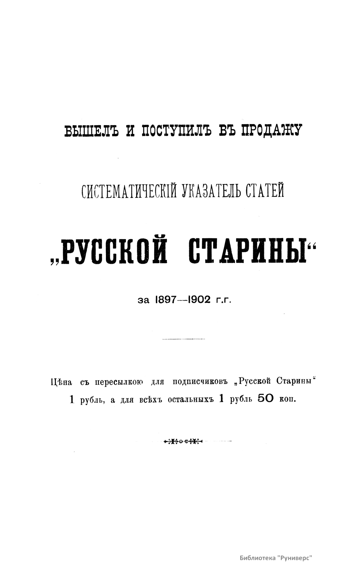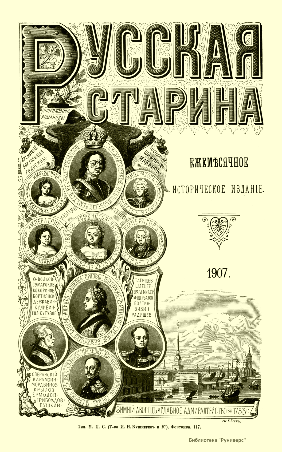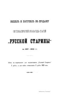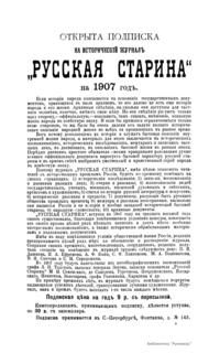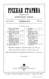 «Русская старина», ежемесячный исторический журнал, выходил в Петербурге в 1870-1918. Основан, издавался и редактировался (1870-1892) М. И. Семевским при участии В. И. Семевского. Последующими редакторами были Н. К. Шильдер (1892-1896), Н. Ф. Дубровин (1896-1904), военные историки С. П. Зыков, П. Н. Воронов.