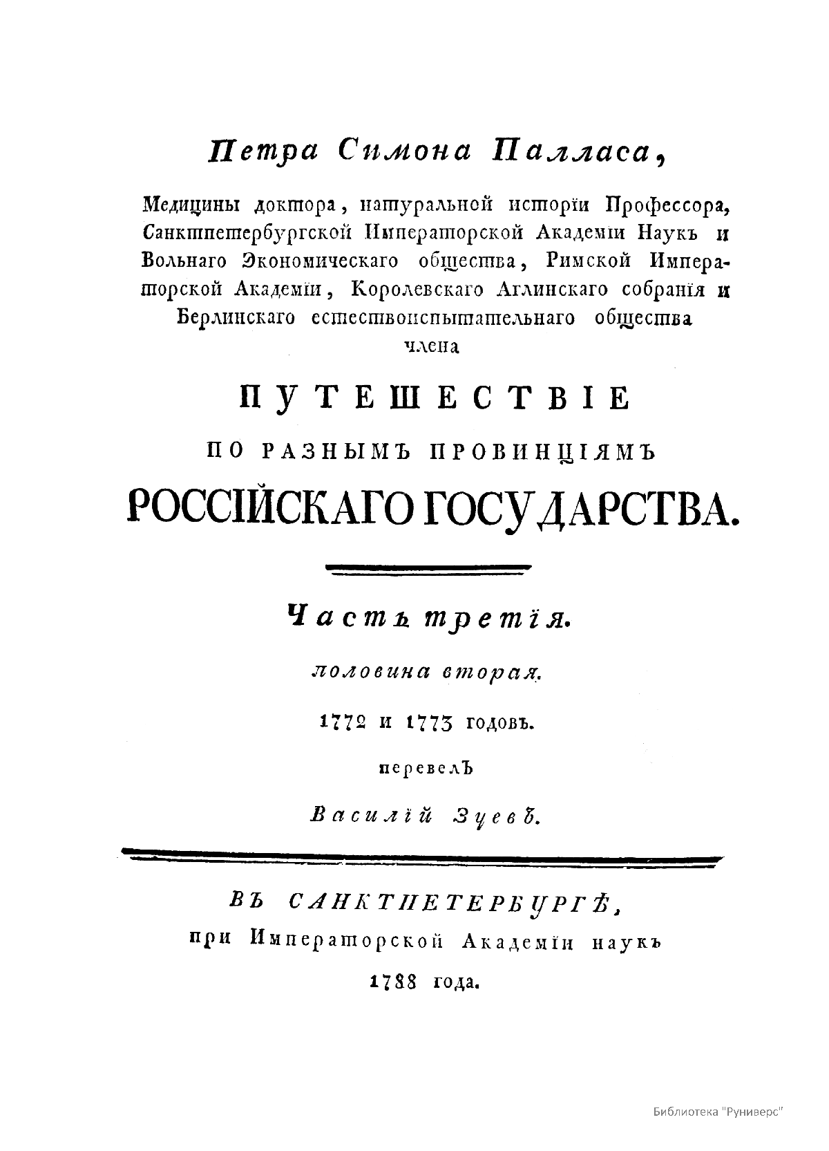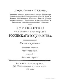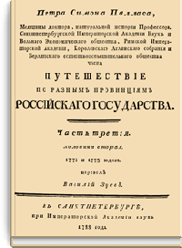 Научные труды П.С. Палласа выходили сначала на родном ему, немецком языке, а потом переводились на русский. Перевод с немецкого труда «Путешествие по разным местам Российского государства» в трех частях (пяти книгах) был выполнен Ф. Туманским и учеником Палласа, Василием Зуевым, состоявшим в его экспедиционном отряде. Впервые на русском языке «Путешествие…» было издано в 1773–1788 гг. в серии «Собрания, старающегося о переводе иностранных книг», учрежденной Екатериной II.