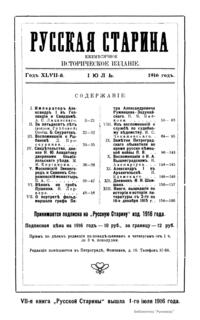 «Русская старина», ежемесячный исторический журнал, выходил в Петербурге в 1870-1918. Основан, издавался и редактировался (1870-1892) М. И. Семевским при участии В. И. Семевского. Последующими редакторами были Н. К. Шильдер (1892-1896), Н. Ф. Дубровин (1896-1904), военные историки С. П. Зыков, П. Н. Воронов.