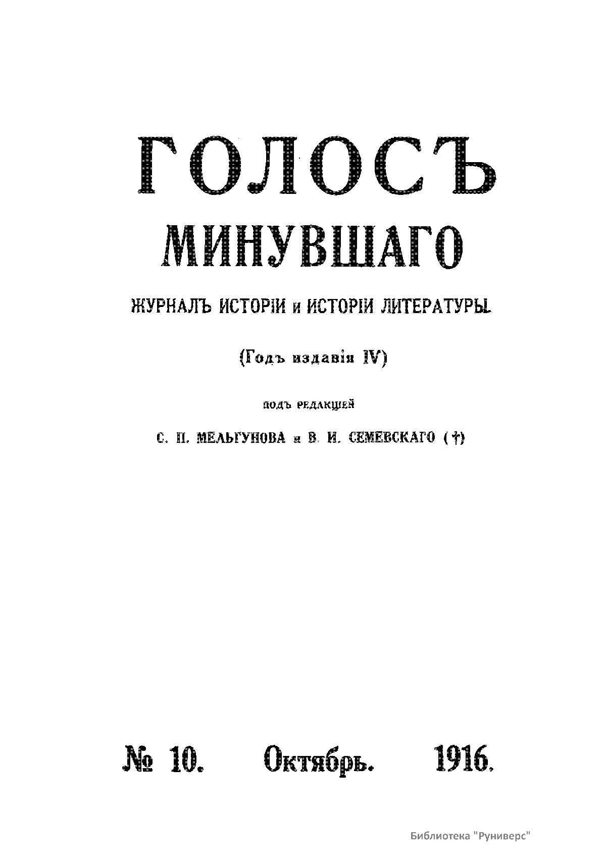 «Голос Минувшего» — журнал истории и истории литературы либерально-народнического направления, издававшийся в Москве с 1913 по 1923 год. Издателем журнала в 1913–1922 годах были известные русские историки, публицисты и общественные деятели С. П. Мельгунов (1880–1956) и В. И. Семевский (1848–1916). В редакционную коллегию также входили А. К. Дживелегов и П. Н. Сакулин. До 1919 «Голос минувшего» выходил ежемесячно, затем нерегулярно, всего было выпущено 65 номеров. В журнале публиковались интереснейшие материалы, посвященные истории литературы и общественных движений в России второй половины XVIII – начала XX веков. Здесь можно найти: статьи по вопросам русской и всеобщей истории, истории литературы, философии, искусства и археологии. В издании представлены: историческая беллетристика, биографии русских и иностранных деятелей, критика и библиография, новости русской и иностранной науки, обзор журналов русских и иностранных, хроника, мемуары, записки, дневники и письма декабристов, видных народовольцев и эсеров, крупных общественных деятелей и царских администраторов, писателей, военачальников и др. Среди авторов: Е. В. Тарле, А. Ф. Кони, А. К. Дживелегов, А. А. Кизеветтер, В. Г. Короленко и др. Стремление сделать журнал интересным для более широкого круга читателей способствовало тому, что в «Голосе Минувшего», хоть и в ограниченном количестве, печатались статьи по истории искусства и помещались иллюстрации: портреты, картины и рисунки, не знакомые или мало знакомые публике. В журнале опубликован целый ряд интересных писем, документов и воспоминаний. Абсолютное большинство текстов никогда не переиздавалось. Журнал снабжен указателями имен за 1913–1922 годы и систематическим указателем содержания.