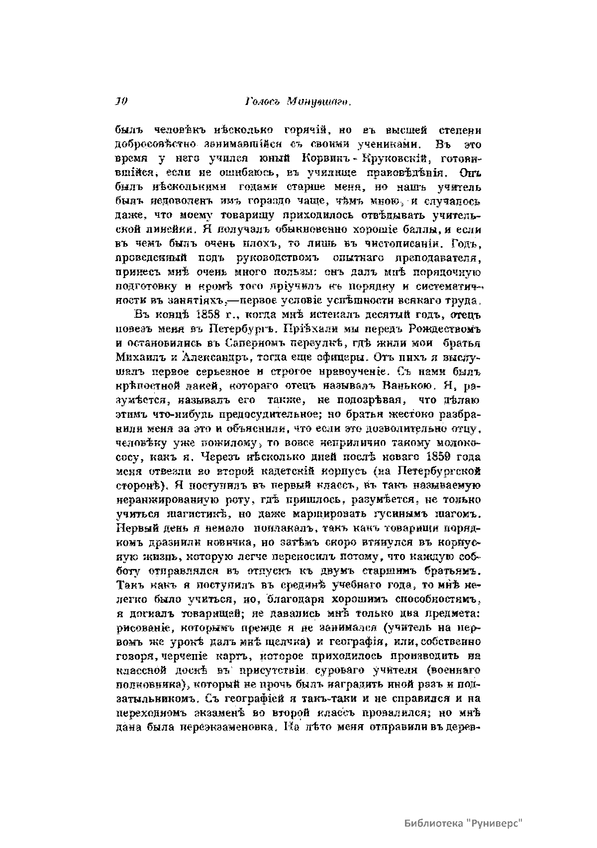 «Голос Минувшего» — журнал истории и истории литературы либерально-народнического направления, издававшийся в Москве с 1913 по 1923 год. Издателем журнала в 1913–1922 годах были известные русские историки, публицисты и общественные деятели С. П. Мельгунов (1880–1956) и В. И. Семевский (1848–1916). В редакционную коллегию также входили А. К. Дживелегов и П. Н. Сакулин. До 1919 «Голос минувшего» выходил ежемесячно, затем нерегулярно, всего было выпущено 65 номеров. В журнале публиковались интереснейшие материалы, посвященные истории литературы и общественных движений в России второй половины XVIII – начала XX веков. Здесь можно найти: статьи по вопросам русской и всеобщей истории, истории литературы, философии, искусства и археологии. В издании представлены: историческая беллетристика, биографии русских и иностранных деятелей, критика и библиография, новости русской и иностранной науки, обзор журналов русских и иностранных, хроника, мемуары, записки, дневники и письма декабристов, видных народовольцев и эсеров, крупных общественных деятелей и царских администраторов, писателей, военачальников и др. Среди авторов: Е. В. Тарле, А. Ф. Кони, А. К. Дживелегов, А. А. Кизеветтер, В. Г. Короленко и др. Стремление сделать журнал интересным для более широкого круга читателей способствовало тому, что в «Голосе Минувшего», хоть и в ограниченном количестве, печатались статьи по истории искусства и помещались иллюстрации: портреты, картины и рисунки, не знакомые или мало знакомые публике. В журнале опубликован целый ряд интересных писем, документов и воспоминаний. Абсолютное большинство текстов никогда не переиздавалось. Журнал снабжен указателями имен за 1913–1922 годы и систематическим указателем содержания.