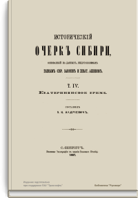 » с тем, чтобы продолжать эту работу впредь. После этого изменил название четвертого и пятого тома, которые стали соответственно первой и второй частью сочинения «Сибирь в царствование императрицы Екатерины II». Данное исследование, представляющее собой собрание материалов по истории Сибири (главным образом это выписки из «Полного собрания законов», а также выборка документов из сенатского архива), в свое время стало видным явлением в историографии Сибири и не утратило своего исторического значения до сих пор.