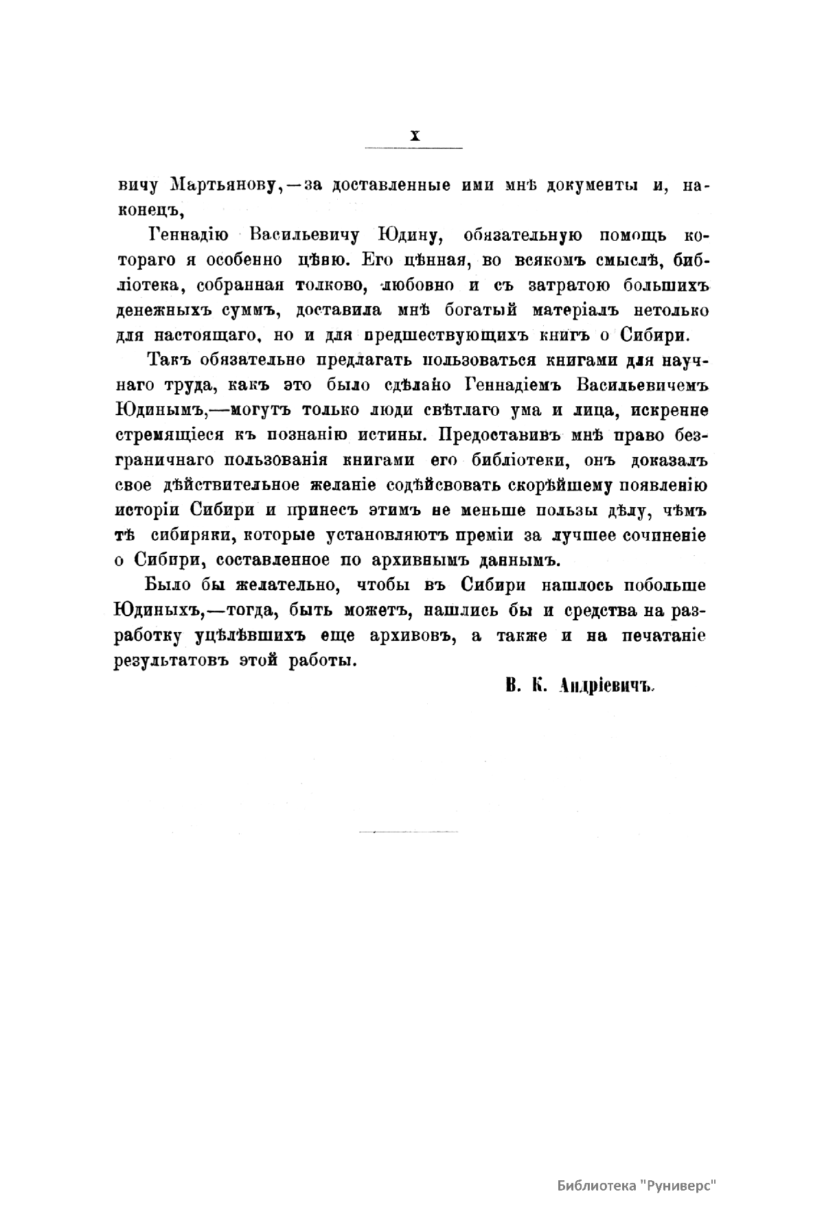 Исследователь В. К. Андриевич в своей работе «Сибирь в XIX столетии» описал географические и природно-климатические условия Сибири, ее хозяйственное и промышленное освоение, быт и культуру инородцев. Анализируя систему управления в Сибири в XIX столетии, он рассматривал вопросы становления в регионе организационных структур полицейского ведомства. По его словам, «на губернаторов были возложены чрезмерные полномочия, что способствовало развитию губернаторского произвола». Но, вместе с тем, автор дал положительную характеристику таким генерал-губернаторам, как Сперанский, Муравьев, Корсаков, Синельников, Анучин. Его работа заложила основы критического осмысления опыта освоения и управления Сибири. Залог успешного развития этого края он видел в его природном богатстве, имея в виду обилие пушного зверя, леса и золота. В исследовании приведены подробные статистические данные. Источниками служили Полное собрание законов Российской империи, архивы: Сената, Каратузской станицы Минусинского округа, Красноярской городской управы, рукописи из библиотеки Минусинского музея, документы из библиотеки Енисейского музея, периодические издания.