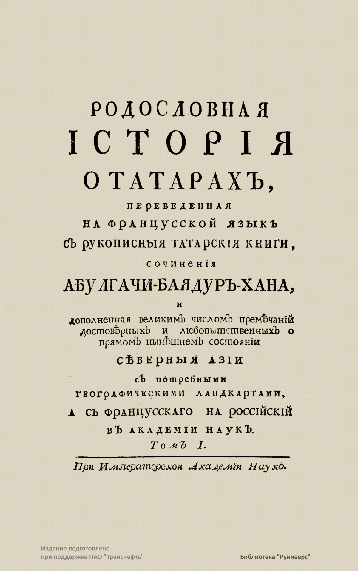 Данное издание является раритетным историческим источником по генеалогии, истории и географии тюркского этноса и Северной Азии. Это перевод на русский язык исторического труда Абулгази-Баядур-Хана «Родословное древо тюрок», написанного им в 1660–1663 годах. Закончил сочинение его сын Мухаммед Ануш, который довел повествование до 1663 года. Рукопись была открыта подполковником шведской армии Ф. И. Т. Страленбергом в Тобольске, где он находился в ссылке после Полтавского сражения (1709). Она была записана русским писцом со слов татарского переводчика. Швед Шенстрем, по поручению русского царя положивший начало научному изучению истории, географии и топографии Сибири, сделал перевод на немецкий язык. Сочинение было издано в Брюсселе Варенном (Varenne de Mondasse) в 1726 году уже на французском языке. Оно вышло под названием «Histoire généalogique des Tartares, traduite du manuscript tartare d Abulgasi-Bayadur-Chan» с подробными примечаниями Бетинка. В 1734 году Академия наук поручила В. К. Тредиаковскому перевести книгу с французского на русский язык. В 1745 году перевод был передан Г. Ф. Миллеру для «исправления» и «изъяснения» некоторых «известий», а также для составления примечаний на основании материалов, собранных им в Сибири. В 1768 году сочинение было выпущено в свет в двух томах тиражом 1512 экземпляров. В книге представлены две карты.