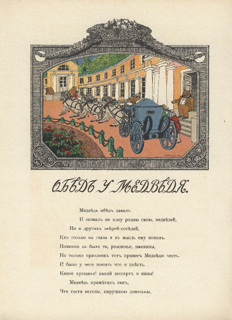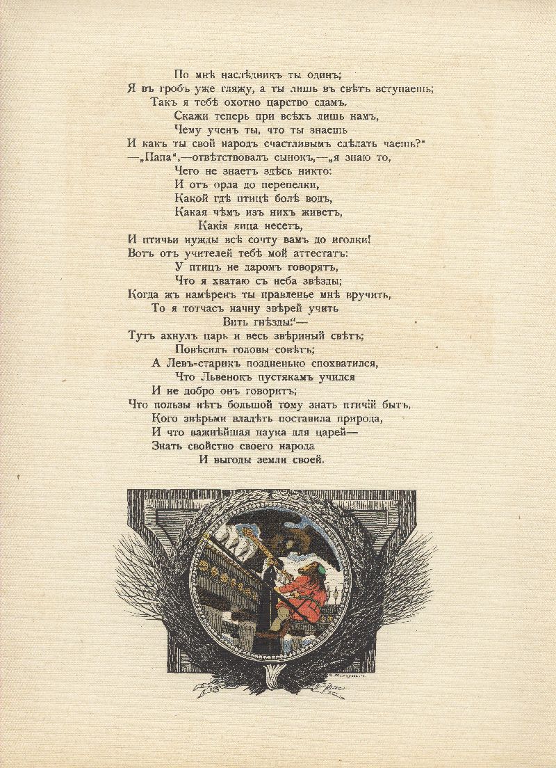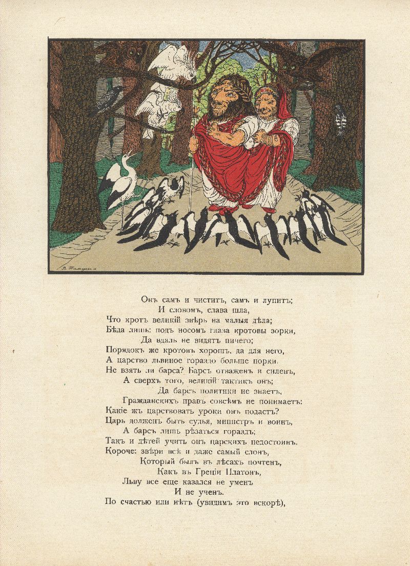 Многие рисунки вставлены в специальные рамки, которые призваны подчеркнуть эстетику ушедшей эпохи ампира, в которую жил и творил автор басен. Яркие цветные иллюстрации с «очеловеченными» персонажами мира зверей были намного более воспринимаемы детьми, чем отстраненная, «взрослая» графика Нарбута.