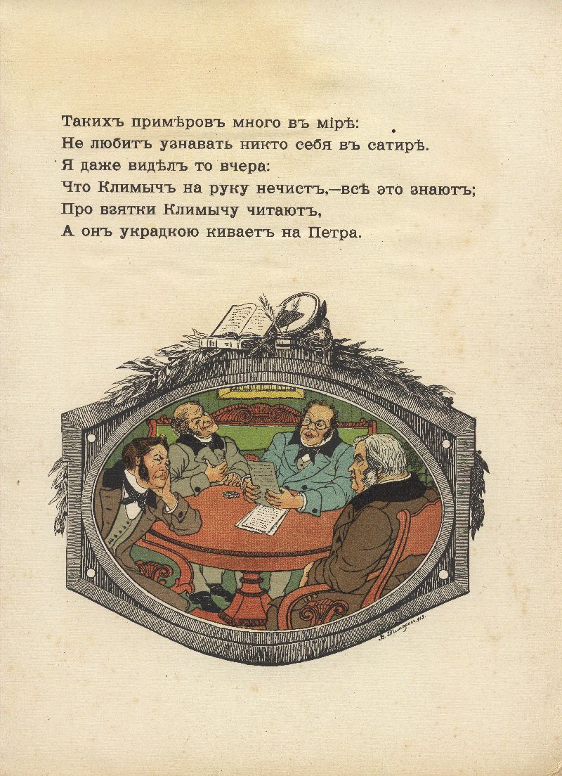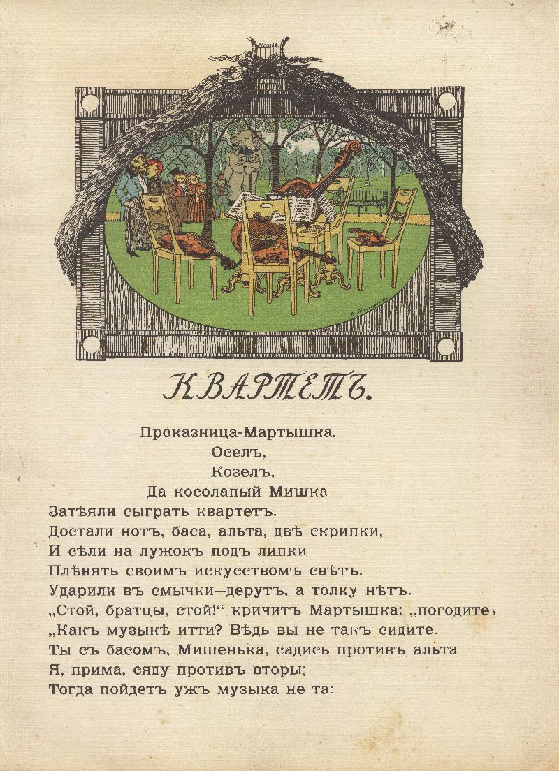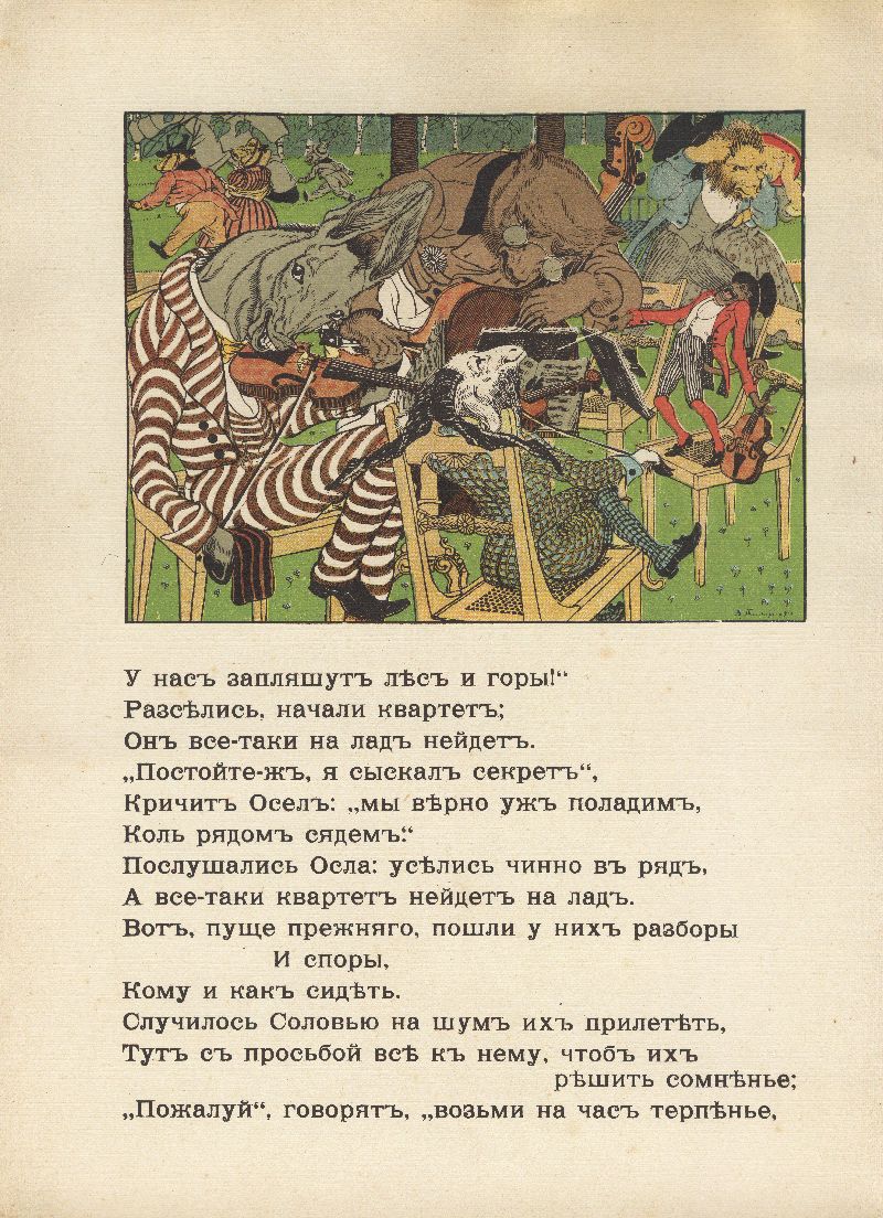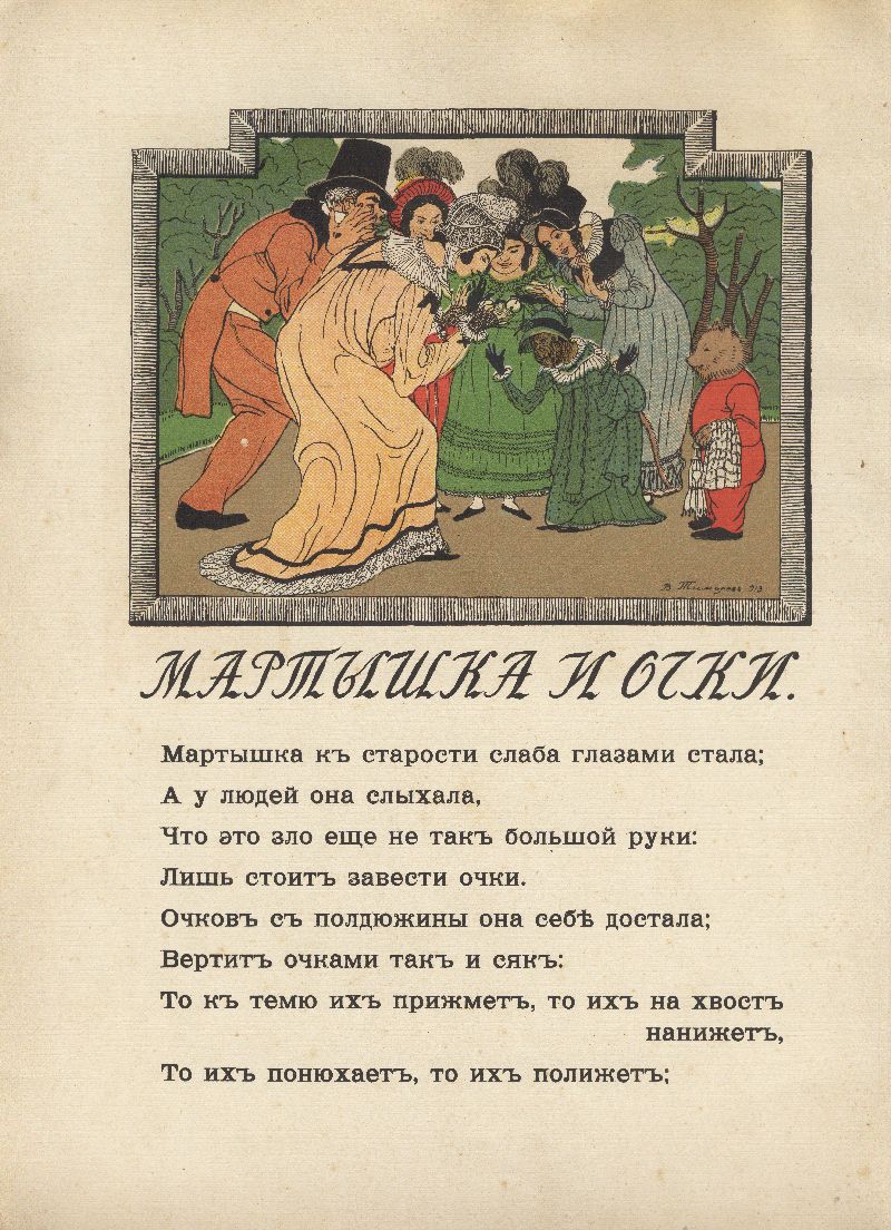 Возможно, Кнебель хотел привлечь к иллюстрированию басен различных художников. Так, например, издание 1912 года иллюстрирует Егор Нарбут. Серия оформлена в стилистике классицизма – своеобразная дань Крылову и его эпохе. Иллюстрации Тиморева на первый взгляд могут показаться не особо изящными. Они выполнены яркими красками против черно-белых точеных силуэтов Нарбута и написаны слишком натуралистично. Такие иллюстрации не соответствуют художественной эстетике начала ХХ века, но, возможно, именно такова и была задумка Кнебеля и Тиморева – изобразить героев басен в классицистическом стиле.