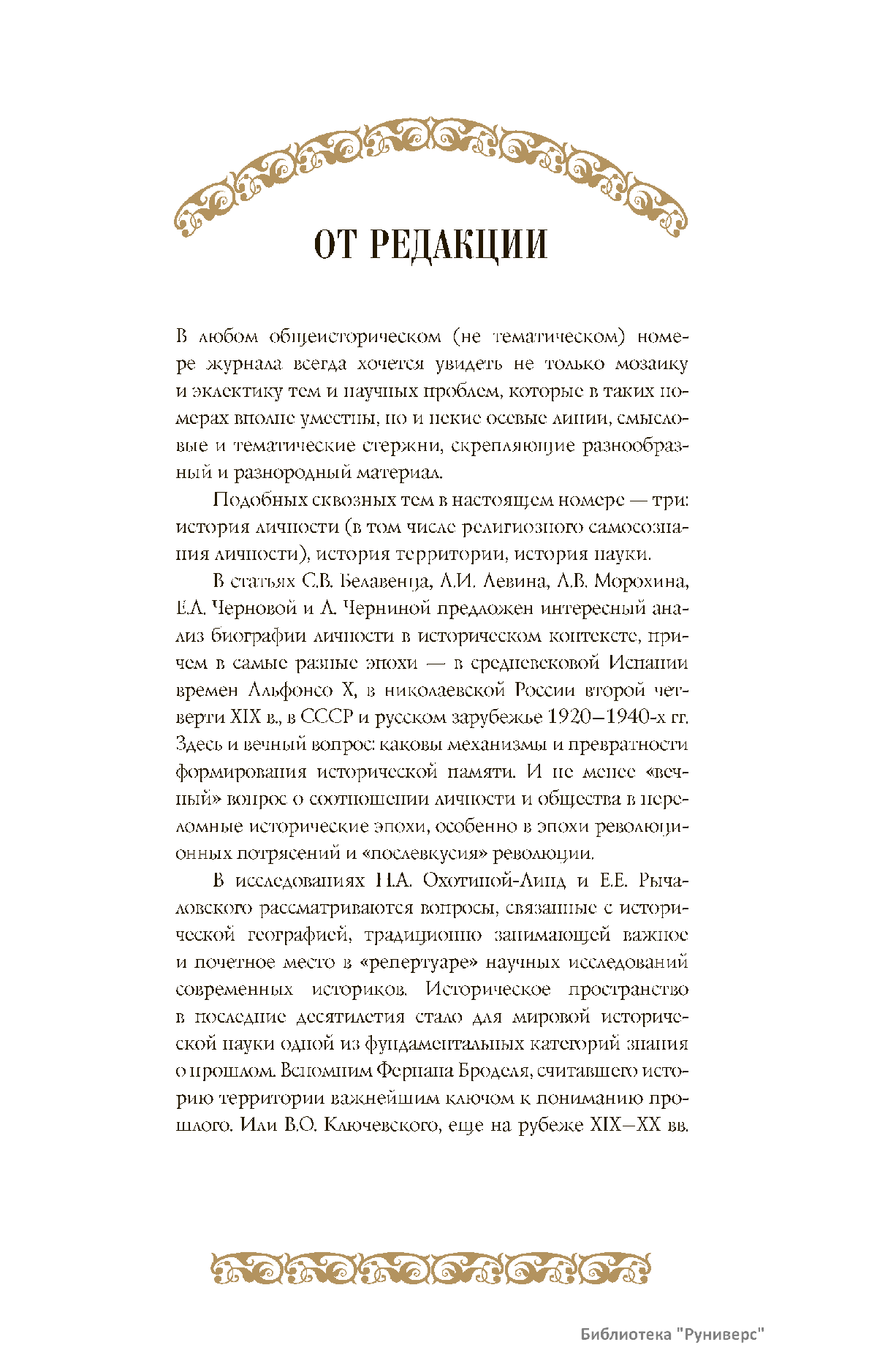 Дорогие коллеги, мы представляем вам первый номер «Исторического вестника», который одновременно обозначается 148-м томом, тем самым продолжая дореволюционное издание. Однако, перешагивая почти сто лет, мы понимаем, что реалии XXI века определяют и новое содержание журнала. История сегодня во многом актуализирована политикой. Именно геополитическая ситуация в мире, возвращающая нас к вопросам сохранения существующих границ, национальных и культурных ценностей, моральных и религиозных принципов, формирует еще одно измерение — проблему аутентичного исторического бытования народов и государств. С одной стороны, это вопрос географических ареалов государственных образований, с другой — тема, связанная с соприкосновением, взаимодействием процессов, культур и традиций. Во многом мы стоим и перед важнейшей этической проблемой. Мы должны не только вежливо и настойчиво указывать нашим уважаемым соседям на свои исторические права, но и сами уходить от искушения искусственного удревнения собственной истории или присвоения чужой. И здесь на сцену выходит его величество Исторический Научный Факт. Он и есть главный цензор и законодатель. На этом незыблемом основании будет строиться редакционная и научная работа «Исторического вестника».