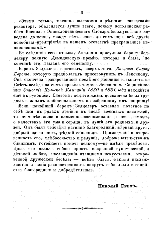 Военный энциклопедический лексикон впервые издавался с 1837 по 1850 год и насчитывает 14 основных томов и один дополнительный (вышел в 1852 г.). Этот огромный труд обязан своим появлением почти исключительно энергии и настойчивости его редактора барона Л. И. Зедделера, на котором лежала вся основная масса работы. По сути своей «Лексикон» являлся первой русской военной энциклопедией (до него выходил только двухтомный «Военный словарь» С. А. Тучкова, в 1818 г.). Несмотря на довольно холодный приём военными кругами первых выпусков «Лексикона», выходившего небольшими книжками (известно, что первая часть состояла из четырёх отдельных книжек) через значительные промежутки времени и стоившего в продаже весьма немалых денег, Зедделер настойчиво занимался его изданием, вложив, помимо личного труда, и значительную часть своего состояния, и в течение 13 лет привёл его к окончанию. Программа «Лексикона» была намечена чрезвычайно широко, имея в виду крайне низкий образовательный уровень армейского офицерства времён императора Николая I и трудность пополнения общего образования при глухих стоянках и постоянном передвижении полков с места на место. В силу этого в «Лексикон» включён ряд сведений, весьма отдалённо связанных с военным делом. Барону Зедделеру удалось привлечь к составлению «Лексикона» наиболее выдающихся военных и учёных Николаевского времени, среди которых особо выделяются К. Ф. Багговут, М. И. Богданович, К. М. Базили, А. В. Висковатов, Н. С. Голицын, А. Н. Греч, Д. А. Милютин, А. И. Михайловский-Данилевский, П. И. Рикорд и другие. Из отделов «Лексикона» наиболее полным и наиболее тщательно составленным является военно-исторический отдел; слабее всего выглядит отдел военной техники, что вполне соответствует тогдашнему её состоянию. «Лексикон» построен по алфавиту статей; к некоторым томам сделано особое «Прибавление», включающее в себя некоторые статьи, пропущенные по разным причинам в предыдущих томах. В связи с долгим изданием «Лексикона» и достаточно быстрым устареванием имеющихся в нём сведений, в 1852 г. был выпущен дополнительный том под названием «Прибавление к Военному энциклопедическому лексикону».