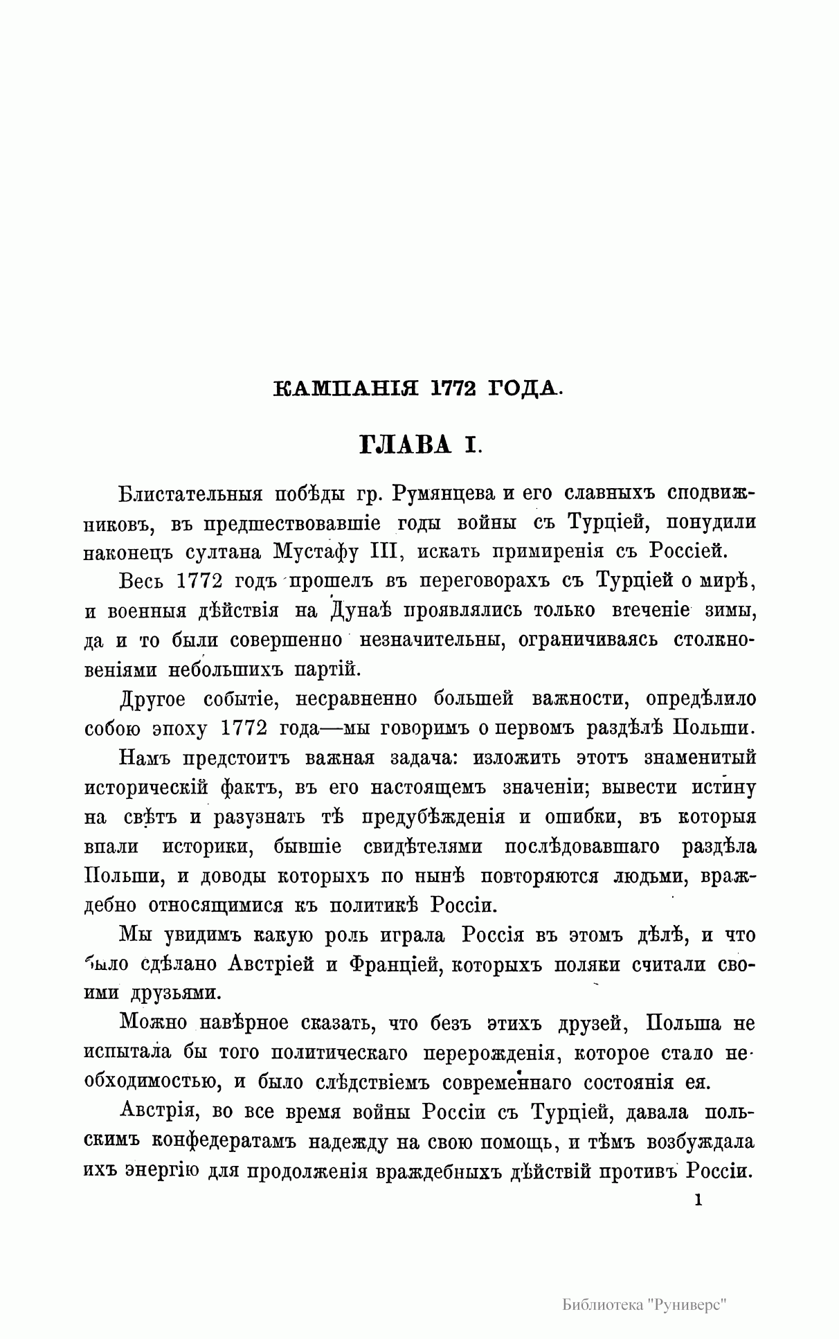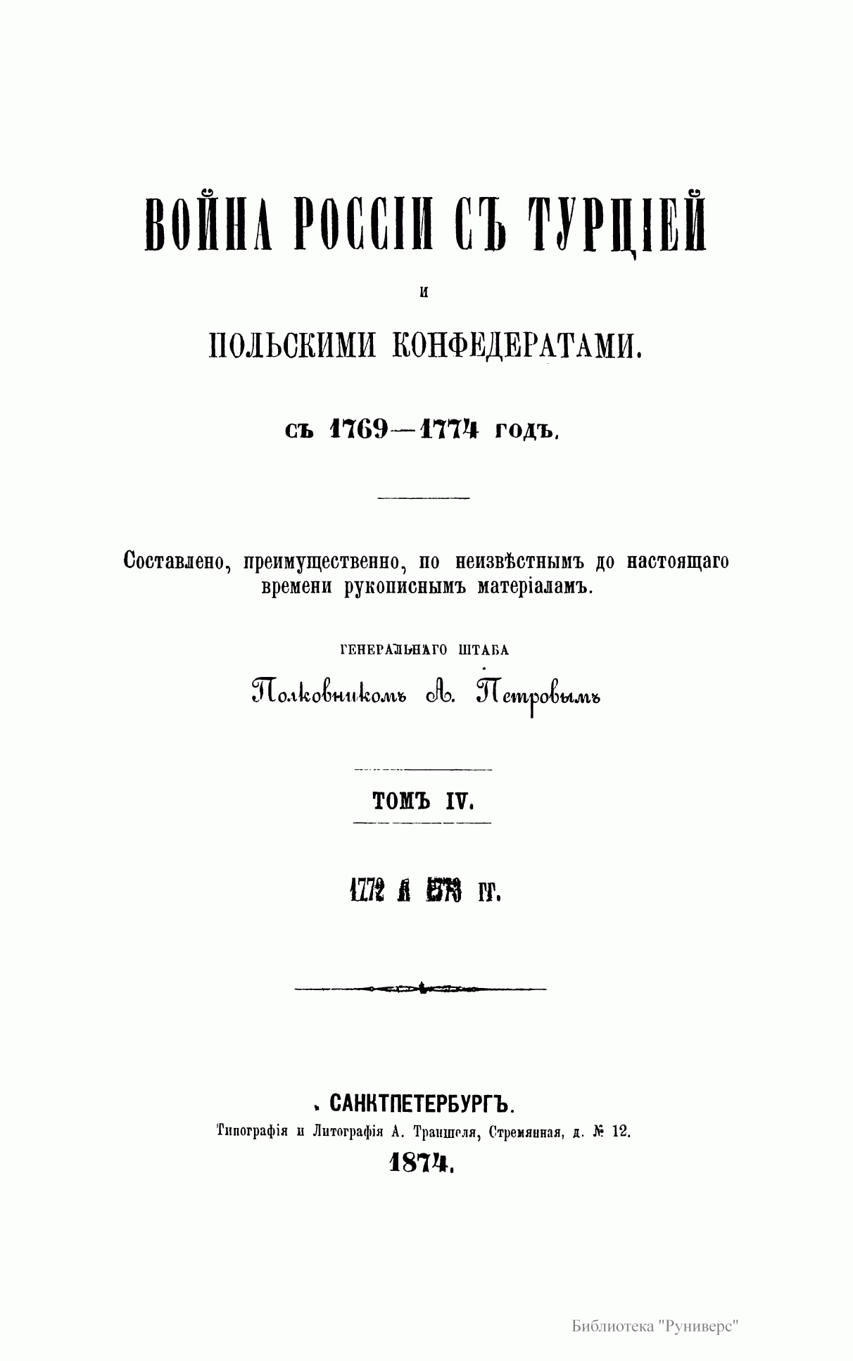 Предпринимая описание первой турецкой войны, в царствование Екатерины II, автор старался изложить военные и политические события того времени с возможною полнотой, насколько это позволяли известные ему рукописные материалы архивов, генерального штаба, государственного и министерства иностранных дел. Петрову посчасливилось одним из первых разбирать дела управления графа Румянцева, только переданные в архив генштаба.