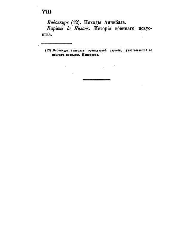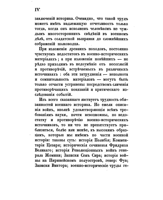 Автор рассматривает только те военные события, которые имели влияние на судьбу народов исторического мира или развитие военного искусства. В истории военного искусства он выделяет следующие периоды: Греческий – от Троянской войны (1194 – 1184 до Р. Х.) до покорения Римлянами Греции (146 г. до Р. Х.); Римский – от основания Рима (754 г. до Р. Х.) до падения Западной Римской империи (476 г. по Р. Х.); период постепенного возрождения военного искусства – от падения Западной Римской империи до Густава Адольфа или начала 30-летней войны (1618 г.); период новейшей военной истории – от начала 30-летней войны до настоящего времени. Период новейшей военной истории в издание не вошел.