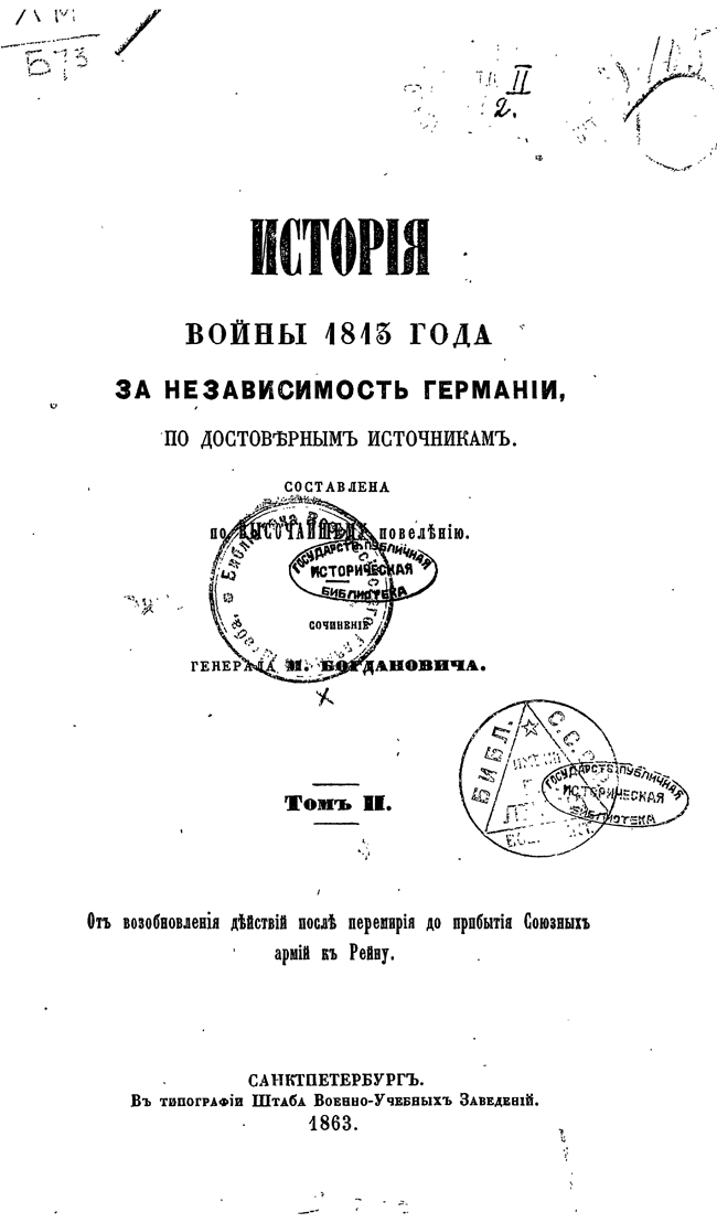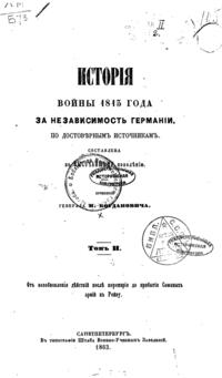 «История войны 1813 года за независимость Германии» есть продолжение составленной Богдановичем «Истории Отечественной войны 1812 года». Основной мыслью сего труда было желание представить верную картину одной из важнейших эпох не только русской, но и всемирной истории.