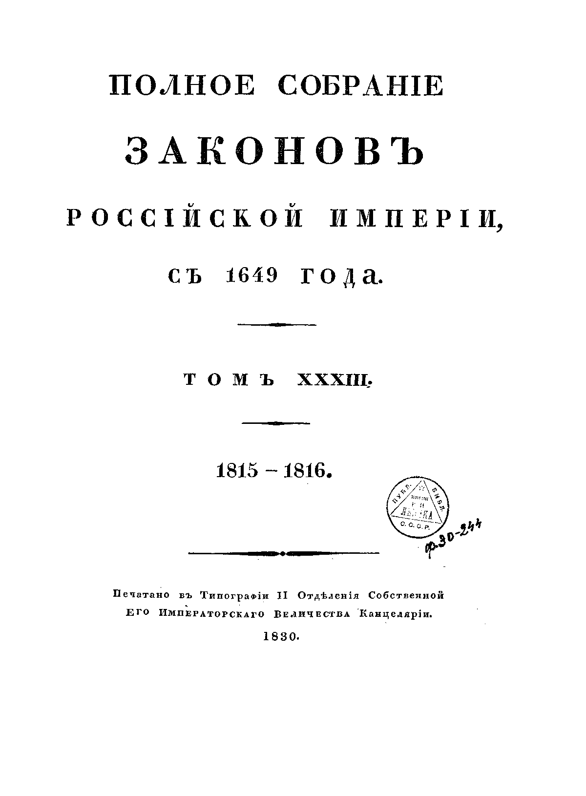 Полное собрание законов Российской Империи. Собрание Первое. Том XXXIII