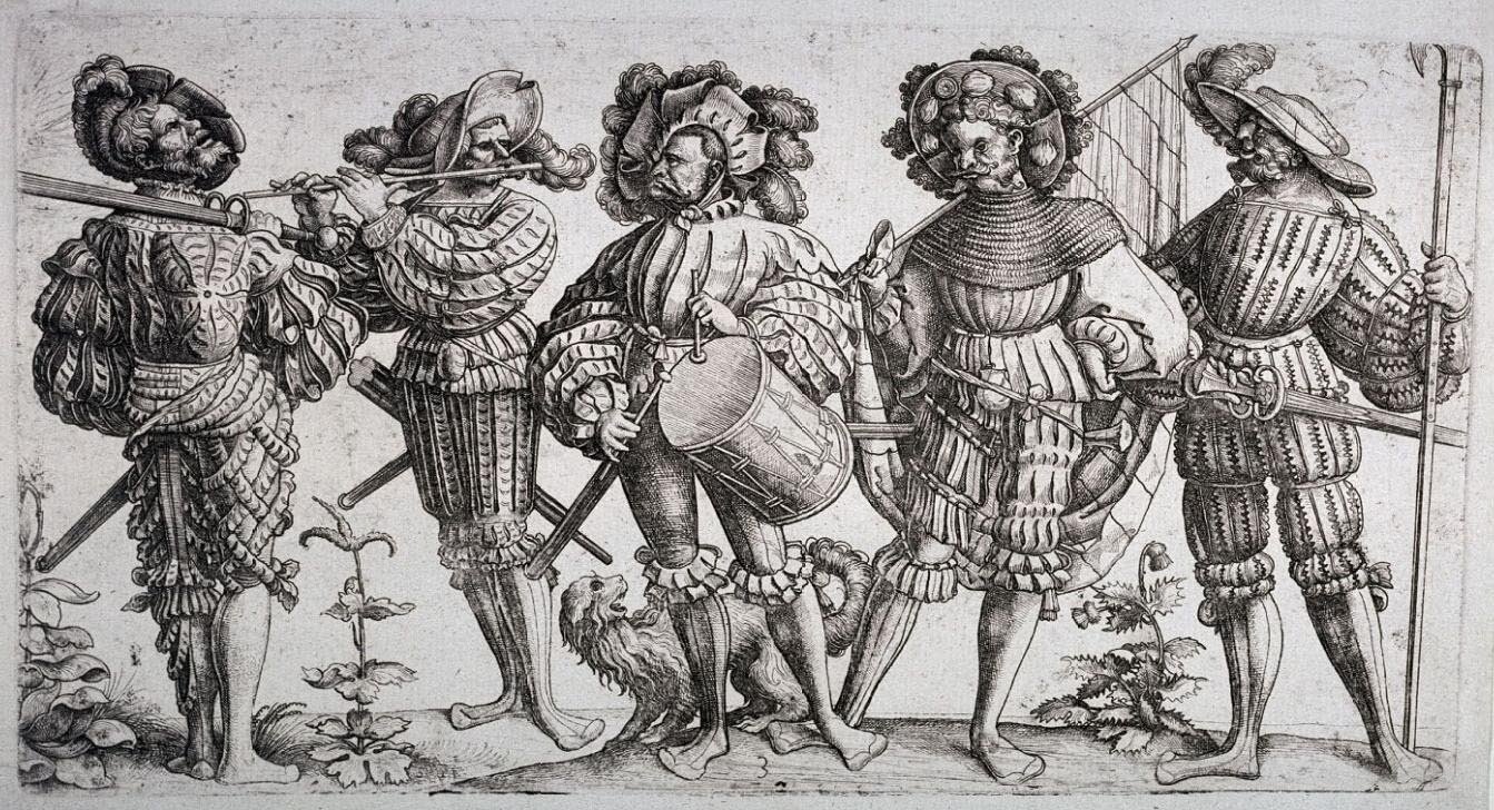 Серия: Поход ландскнехтов. Лист № 6. Техника: гравюра на дереве, ручная раскраска. Раскрасчик и гравёр: Эрхард Шён. Автор текста: Ганс Сакс. Место издания: Нюрнберг. Датировка: 1532 – 1542 гг. Музей герцога Антона Ульриха, Брауншвейг, Германия.
