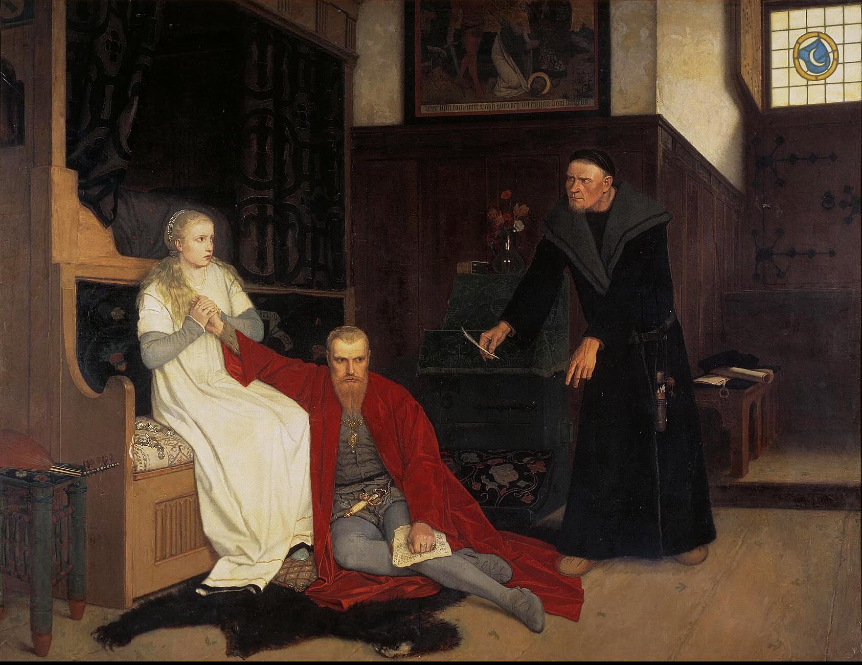 1568 год. Король Швеции Эрик XIV впал в безумие, был свергнут с престола и заключен под стражу, потеряв «все королевские права на Швецию». ...Эрика с самого начала тревожили стремления крупных вельмож к независимости. Стремясь заручиться поддержкой мелкого дворянства, он на важных постах заменял аристократов людьми более скромного происхождения, которым доверял больше. Его правой рукой был Георг Перссон, исключительно умный, но честолюбивый и жадный человек, ставший государственным секретарём. Под его руководством недавно учреждённый Высокий суд определял быстрые, жестокие наказания благородным преступникам, которые якобы критиковали корону. Количество и характер обвинений, иногда доходящих до смешного — например, кто-то нарисовал королевский герб вверх ногами, — говорит о болезненной подозрительности короля, его постоянном страхе перед возможными заговорами высокородных подданных. Он опасался, и в конце концов это стало навязчивой идеей, что вельможи намерены вернуть свои древние права и ослабить власть короны. Подозрения прежде всего были направлены на могущественную семью Стуре. Король пришёл к выводу, что его матримониальные планы расстроены аристократическим заговором, цель которого — не дать ему обзавестись законными наследниками; любовниц и незаконных детей у него хватало. Но его политика не была ни последовательной, ни понятной. Он подверг страшному унижению Нильса Стуре, потому что астрологи сказали, что шведская корона может перейти к «светловолосому человеку» (хотя Нильс был скорее рыжеволосым). Он пообещал Нильсу руку своей незаконной дочери Виргинии и назначил его послом по вопросу своего очередного матримониального плана. Проект был заведомо неосуществим, но неудача Стуре в переговорах усилила подозрения короля относительно аристократического заговора. Становилось всё очевидней, что разум короля расшатывается. Он беспокойно прокрадывался по коридорам своего королевского замка с намерением обнаружить какое-нибудь преступление. Ему казалось, что королевские пажи одеты чересчур элегантно — значит, хотят соблазнить женщин при его дворе. Королевский камергер предстал перед Высоким судом, потому что скипетр короля был найден поломанным в его комнате. Опасно было что-то прошептать соседу, даже откашляться, так как это могло скрывать заговор. Два охранника были приговорены к смерти на том основании, что они оставили кувшин, плащ и недоуздок в королевской уборной. Если король проходил мимо стогов сена, покрытых еловыми ветками, он впадал в безудержный гнев, потому что перевёрнутые ёлки напоминали ему триумфальную арку Нильса Стуре. В довершение всего назрел ещё один критический момент. Эрик решил жениться на своей любовнице Карин Монсдоттер, девушке низкого происхождения, дочери тюремщика; она прислуживала в таверне. Похоже, он её действительно любил. Но женитьба на ней всколыхнула бы всю скопившуюся ярость шведской аристократии, которая была бы глубоко оскорблена таким мезальянсом. И личное, и общественное напряжение оказалось слишком велико. Мозг Эрика поддался атаке шизофрении. Король, убеждённый в существовании аристократического заговора против него, приказал арестовать ряд вельмож и предать Высокому суду; тот угодливо приговорил их к смерти. Нильс Стуре, который только что возвратился по