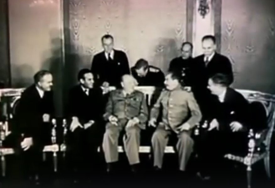 Английский аристократ Черчилль (убежденный антикоммунист), американский аристократ Рузвель (демократ) и сын сапожника Сталин (лидер партии советских коммунистов) – решали судьбу мира. Второй фронт был открыт, осуществлена высадка десанта союзников во Франции. Пролив Ла-Манш пересечен. Началось освобождение Западной Европы. Освобожден Париж. Возвращение после долгих лет эмиграции Шарля де Голля. Переговоры глав государств союзников в Ялте. Встреча советских и американских войск на Эльбе. Жуков награждает советскими орденами генералов Монтгомери и Эйзенхауэра.