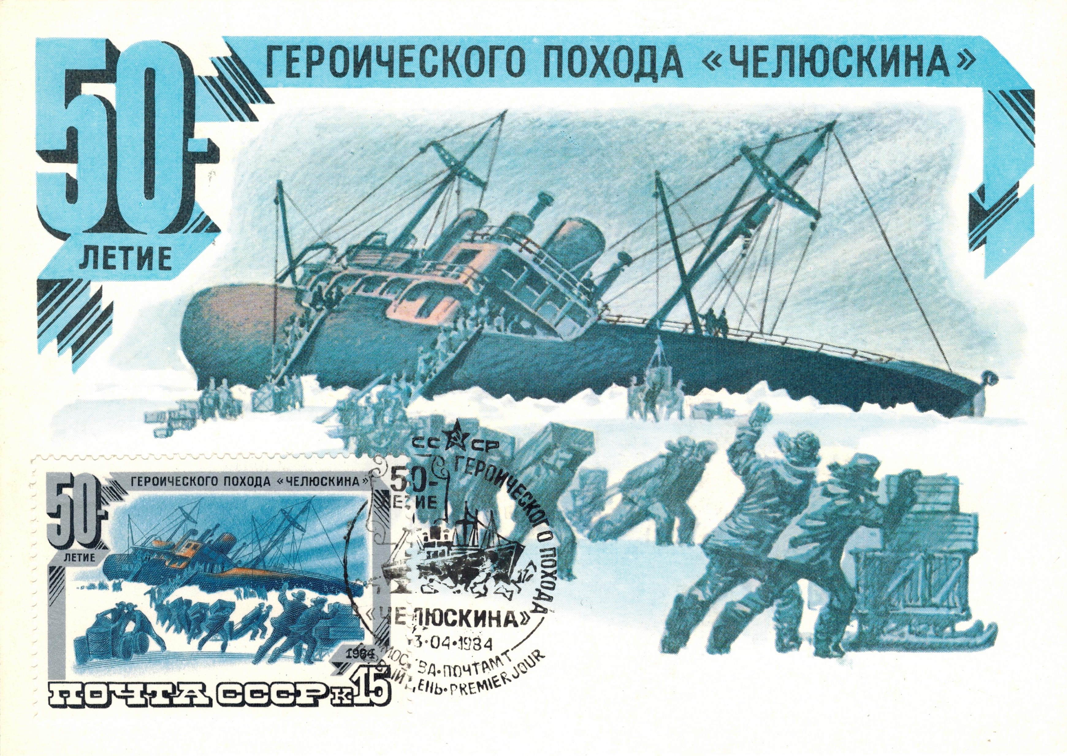 Советский почтовый конверт и марка, посвящённые 50‑летию героического похода ледокольного парохода «Челюскин»