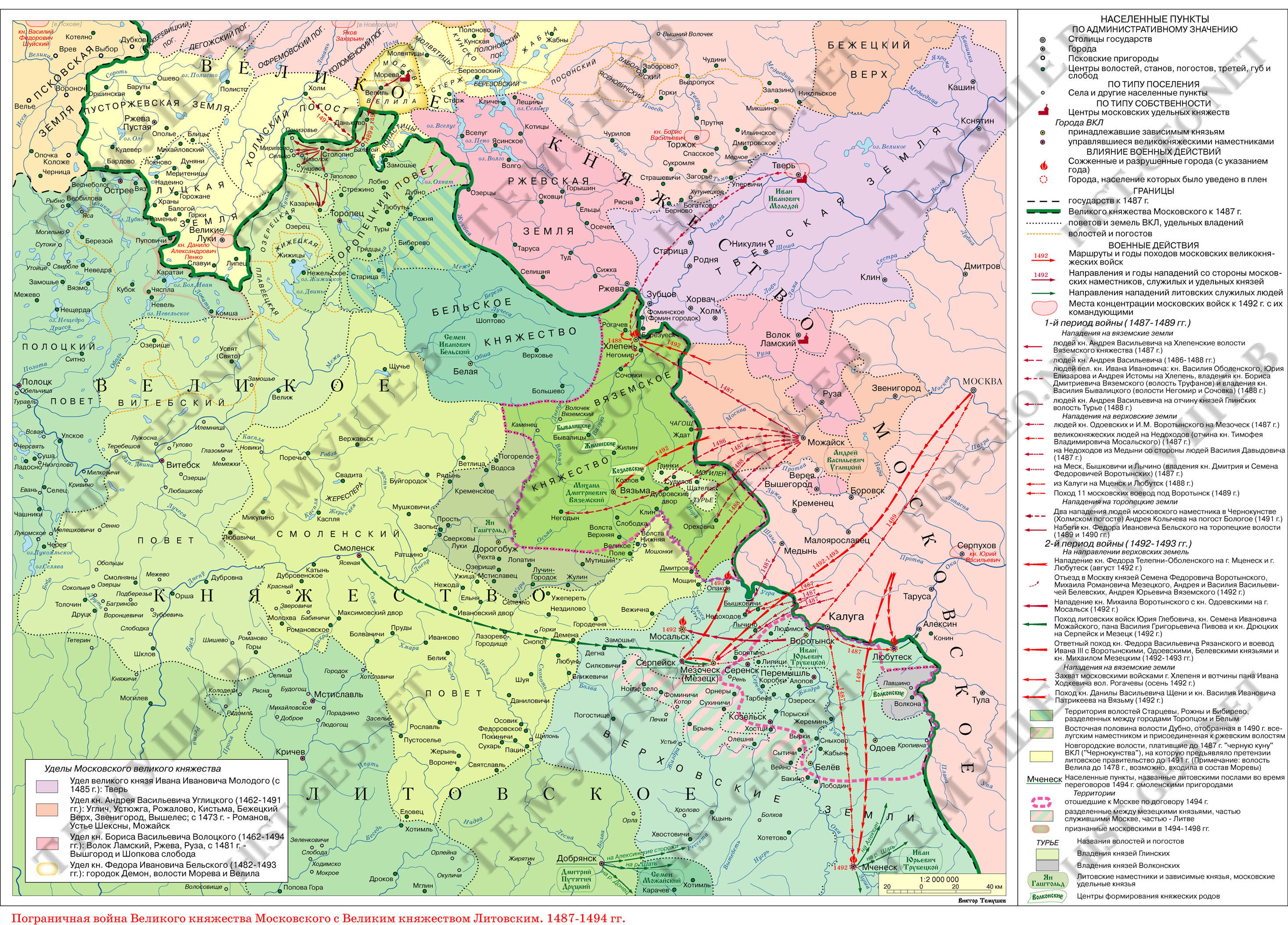 «В Генваре 1494 году Великие Послы Литовские, Воевода Троцкий, Петр Янович Белой и Станислав Гастольд, Староста Жмудский, прибыли в Москву для заключения мира. Они хотели возобновить договор Казимиров с Василием Темным, а наши Бояре древнейший Ольгердов с Симеоном Гордым и отцем Донского. Первые уступали Иоанну Новгород, Псков и Тверь в вечное потомственное владение, но требовали всех иных городов, коими завладели Россияне в новейшие времена. "Вы уступаете нам не свое, а наше", - сказали Бояре. Спорили долго, хитрили и несколько раз прерывали сношения; наконец согласились, чтобы Вязьма, Алексин, Тешилов, Рославль, Венев, Мстислав, Торуса, Оболенск, Козельск, Серенск, Новосиль, Одоев, Воротынск, Перемышль, Белев, Мещера остались за Россиею; а Смоленск, Любутск, Мценск, Брянск, Серпейск, Лучин, Мосальск, Дмитров, Лужин и некоторые иные места по Угру за Литвою. Князьям Мезецким, или Мещовским, дали волю служить, кому они хотят. Александр обещал признать Великого Князя Государем всей России, с тем, чтобы он не требовал Киева. Тогда Послы Литовские, вторично представленные Иоанну, начали дело сватовства, и Государь изъявил согласие выдать дочь свою, Елену, за Александра, взяв слово, что он не будет нудить ее к перемене Веры. На другой день, Февраля 6, в комнатах у Великой Княгини Софии они увидели невесту, которая чрез Окольничего спросила у них о здоровье будущего супруга. Тут, в присутствии всех Бояр, совершилось обручение. Станислав Гастольд заступал место жениха, ибо старшему послу, Воеводе Петру, имевшему вторую жену, не дозволили быть действующим в сем обряде. Иереи читали молитвы. Обменялись перстнями и крестами, висящими на золотых цепях. Февраля 7 Послы именем Александра присягнули в верном соблюдении мира; а Великий Князь целовал крест в том же. Главные условия договора, написанного на хартии с золотою печатию, были следующие: "1) Жить обоим Государям и детям их в вечной любви и помогать друг другу во всяком случае; 2) владеть каждому своими землями по древним рубежам; 3) Александру не принимать к себе Князей Вяземских, Новосильских, Одоевских, Воротынских, Перемышльских, Белевских, Мещерских, Говдыревских, ни Великих Князей Рязанских, остающихся на стороне Государя Московского, коему и решить их спорные дела с Литвою; 4) двух Князей Мезецких, сосланных в Ярославль, освободить; 5) в случае обид выслать общих судей на границу; 6) изменников Российских, Михаила Тверского, сыновей Князя Можайского, Шемяки, Боровского, Верейского, никуда не отпускать из Литвы: буде же уйдут, то вновь не принимать их; 7) Послам и купцам ездить свободно из земли в землю", и проч. - Сверх того Послы дали слово, что Александр обяжется грамотою не беспокоить супруги в рассуждении веры. Они три раза обедали у Государя и получили в дар богатые шубы с серебряными ковшами. Отпуская их, Великий Князь сказал изустно: "Петр и Станислав! милостию Божиею мы утвердили дружбу с зятем и братом Александром; что обещали, то исполним. Послы мои будут свидетелями его клятвы".