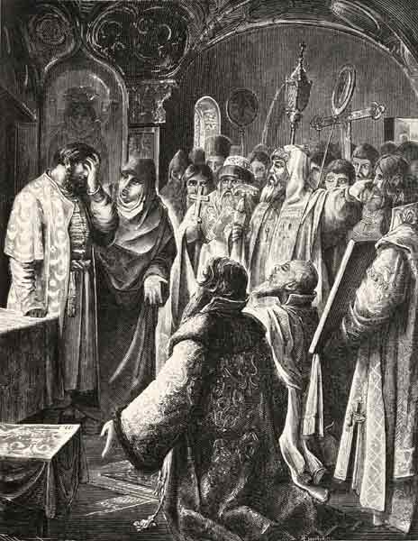Патриарх Иов и московский народ просят Бориса Годунова на царство. Гравюра Езерского по рисунку Медведева. I пол. 1870-х гг.