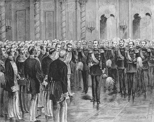 Александр II призывает московских дворян приступить к освобождению крестьянства, 1857 год. Гравюра начала 1880-х гг.