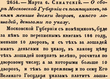 Закон № 2654. 1713 год. 6 марта (17 марта). Указ Правительствующего Сената о замене натуральной повинности по поставке армейских лошадей пропорциональным денежным сбором для мелкопоместных землевладельцев Московской губернии.