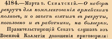 4184. 1723 год. 20 марта (9 марта ст.ст.) Сенатский. О наборе рекрут для комплектования армейских полков, и о зачете взятых в рекруты, поголовно и в работники, на болверки. Правительствующий Сенат слушав из Военной Коллегии доношения приговорили: для комплекта армейских и гарнизонных полков рекрут нарядов прошлых, также и 1722 и сего 1723 годов в Губерниях и провинциях сбирать в самой скорости без всякаго послабления, а взятых с Московской Губернии в 1704 и в 1705 годах, в поголовные солдаты и в работники на болверки 16456 человек зачесть в те вышеписанные наряды <…>