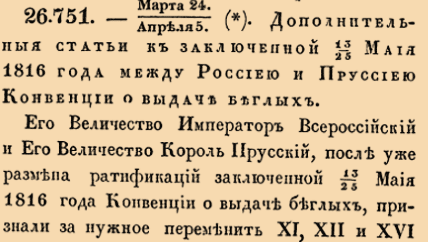 26751. 1817 год. 5 апреля (24 марта ст.ст.) Дополнительныя статьи к заключенной 25 Маия 1816 года между Россиею и Пруссиею Конвенции о выдаче беглых.Его Величество Император Всероссийский и Его Величество Король Прусский, после уже размена ратификаций заключенной 25 Маия 1816 года Конвенции о выдаче беглых, признали за нужное переменить XI, XII и XVI статьи оной, коих исполнение могло бы, вопреки Их взаимным намерениям, подать повод к затруднениям <...>