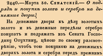 2660. 1713 год. 9 апреля (30 марта ст.ст.) Сенатский. О подряде и покупке золота и серебра на денежные дворы.На денежные дворы к делу золотых золото и в денежные переделы серебро покупать и подряжать из Сената Господину Опухтину, ценою по своему разсмотрению, чтобы тою покупкою на денежных дворах золота и серебра перед прежним умножить <…>