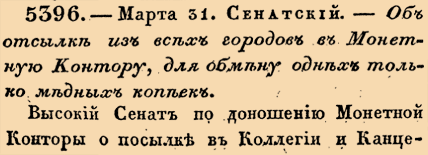 5396. 1729 год. 11 апреля (31 марта ст.ст.) Об отсылке из всех городов в Монетную Контору, для обмену одних только медных копеек. Высокий Сенат по доношению Монетной Конторы о посылке в Коллегии и Канцелярии и в Губернии указов, чтоб из оных присылали для обмену на Денежные дворы одне прежняго дела медныя копейки, которыя по указам надлежит выменивать, кроме прочих монет и денежек и полушек, которых о вымене указа нет <…>
