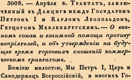 3008. 1716 год. 19 апреля (8 апреля ст.ст.) Трактат, заключенный в Данциге между Государем Петром I и Карлом Леопольдом, Герцогом Мекленбургским. О взаимном союзе и взаимной помощи противу неприятелей, и об утверждении на будущее время торговых сношений коммерческим трактатом.