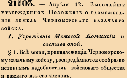 21103. 1847 год. 12 апреля (24 апреля). Высочайше утвержденное Положение о размежевании земель Черноморскаго казачьего войска.