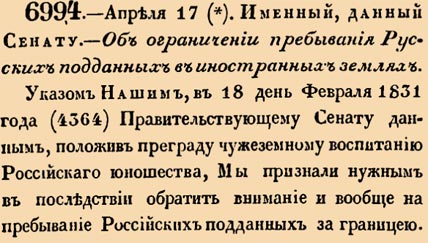 6994. 1834 год. 29 апреля (17 апреля ст.ст.) Именный, данный Сенату. Об ограничении пребывания Русских подданных в иностранных землях.Указом Нашим, в 18 день Февраля 1831 ода (4364) Правительствующему Сенату данным, положив преграду чужеземному воспитанию Российскаго юношества, МЫ признали нужным в последствии обратить внимание и вообще на пребывание Российских подданных за границею. Законами Нашими разрешены, как дворянству, так и всем свободным состояниям, отлучьи за границу с установленными паспортами; но никогда не было разрешаемо оставление отечества и произвольное в чужих краях водворение <…>