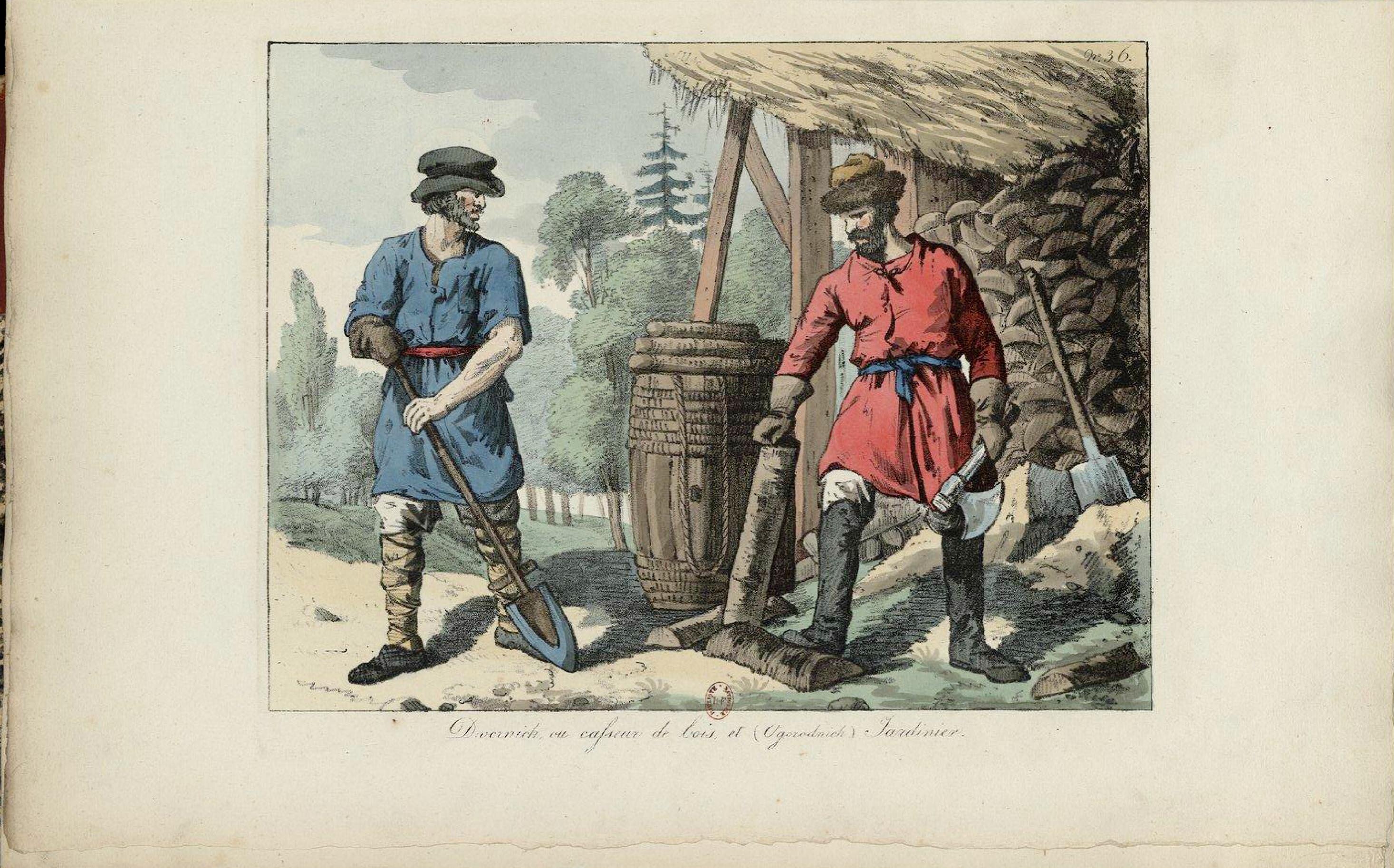 Нынешняя одежда собственно сельского населения России в главных чертах своих совершенно сходна с одеждою Парфян на римских памятниках, и с одеждой Сарматов и родственных им племен, на памятниках босфорских. Это относится преимущественно к мужской одежде, которая состоит вообще из туникообразнаго, спереди совершенно или вполовину открытого кафтана, с длинными рукавами, опоясанного по средине кушаком (фиг. 162 а. Ь.), из более или менее широких шаровар, головной покрышки и обуви. Различные виды двух последненазванных частей костюма восходят, по всему вероятию, также к глубокой древности. Головная покрышка, кроме введенной уже последнее время жесткой шляпы с широкими полями, (?) состоит из высокой шапки, опушенной мехом. Обувью служат тяжелые деревянные башмаки (?), или подвязныя подошвы [прим пер. Подразумеваются, конечно, лапти. Деревянвых башмаков (Holzschuhen) великорусские крестьяне, как известно не носят, а носять их Белоруссы, и то не как обычную обувь. Оговаривать некоторый другие обмолвки автора, мы считаем излишним], или высокие по колено сапоги из толстой кожи. Надевая башмаки или подвязные подошвы, обыкновенно обертывают ноги до колен широкими кусками холста (онучами). Приготовляется одежда эта из толстого сукна и грубого холста, которые до 14 стол. были почти единственными туземными фабрикатами в этом роде. Зимою надевается овчинный тулуп или полушубок и вареги или рукавицы. Волосы на голове, по старо-славянскому обычаю, носят короткие и подрезанные на лбу прямолинейно; бороду отпускают в натуральную величину. Гораздо сильнее по-видимому отразилось монгольское влияние на женской одежде; правда, что и нынешняя одежда русских женщин походит в общем на изображенную на упомянутых памятниках, но вместе с тем представляет и некоторые уклонения от нее, оправдывающие высказанное предположение. К тому же в костюме замужних и незамужних соблюдается (но уже с 14-го ли столетия?) заметная разница, состоящая в том, что первые закутываются в род широкого покрывала, которое они иногда надвигают через голову себе на лицо (?). В остальном одежда тех и других одинакова и состоит из белой холщевой рубашки с длинными и широкими рукавами, суженными у ручной кисти; из длинного, спускающегося до ног, сборчатого платья без рукавов, или с весьма короткими рукавами, открытого спереди и застегнутого во всю длину рядом маленьких пуговок (сарафана), и из короткой, туникообразной накидки с короткими же рукавами, обыкновенно очень высоко подпоясанной (душегрейки); на шее цветной платок; головной убор в виде высокой, жесткой, выдающейся наперед шапки (кичка); на ногах простые башмаки с завязками или без оных. Независимо от пестроты самой ткани, убранством служат еще блестящие металлические украшения, в виде шейных и грудных цепочек, с различными мелкими гремящими привесками, нитки из цветных стеклянных бус, браслеты, кольца и шитье из блесток. Молодые женщины, носят на голове, как особенно нарядный убор, род диадемы совершенно на восточный манер (кокошник).