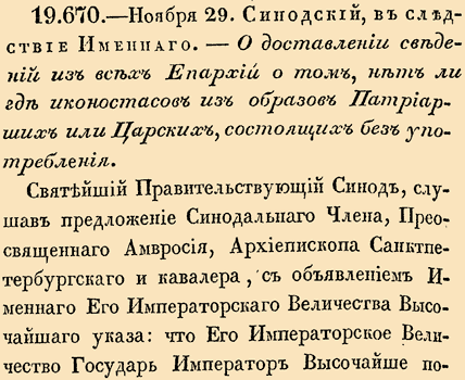 Святейший Правительствующий Синод, слушав предложение синодального Члена, Преосвященного Амвросия, Архиепископа Санктпетербургского и кавалера, с объявлением Именного Его Императорского Величества высочайшего указа: что Его Императорское Величество Государь Император Высочайше повелеть соизволил, чтобы узнать, нет ли где в монастырях или церквах иконостасов из образов Патриарших или Царских состоящих, без употребления? и если найдутся, то доставить описание их, с изъяснением их, если можно, лет, когда образа сии были писаны.