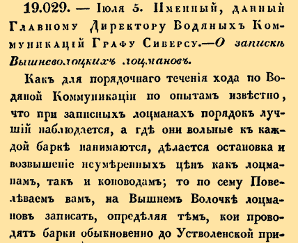 19.029. Именный, данный Главному Директору Водяных коммуникаций Графу Сиверсу. 16 июля (5 июля ст.ст.) 1799 года. Царствование Императора Павла IО записи Вышневолоцких лоцманов.Как для порядочного течения хода по Водянной Коммуникации по опытам известно, что при записывании лоцманов порядок лучший наблюдается, а где они вольные к каждой барке нанимаются, делается остановка и возвышение неумеренных цен как лоцмонам, так и коноводам; то по сему Повелеваем вам, на Вышнем Волочке лоцманов записать, определяя тем, кои проводят барки обыкновенно до Устволенской пристани, лежащей 180 вёрст по ниже Боровицких порогов, умеренную плату от хозяев отправителей, или приказчиков. А как по Рыбинской и Тверской пристаням лоцмана нанимаются обыкновенно обще с коноводами, а иногда и порознь: то представляем вашему ближнему усмотрению, на каковом основании впредь и их записать, чтоб ни остановки, ни чрезмерной передачи в найме, как с нынешним летом случилось,