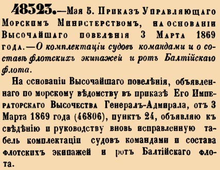 НА основании Высочашаго повеления, объявленнаго по морскому ведомству в приказе Его Императорскаго Высочества Генерал-Адмирала, от 3 марта 1869 года (46806), пункт 24, объявляю к сведению и руководству вновь исправленную табель комплектации судов командами и состава флотских экипажей и рот Балтийскаго флота <…>