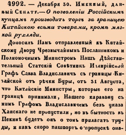 4992. — 30 декабря. Именной [указ], данный Сенату. — О позволении российским купцам вести торговлю за китайской границей всеми товарами, кроме пушнины.