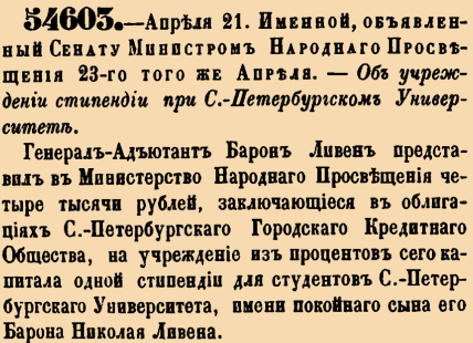 Генерал-Адъютант Барон Ливен представил в Министерство Народнаго Просвещения четыре тысячи рублей, заключающиеся в облигациях С.-Петербургскаго Городскаго Кредитнаго Общества, на учреждение из процентов сего капитала одной стипендии для студентов С.-Петербургскаго Университета, имени покойнаго сына его Барона Николая Ливена <…>