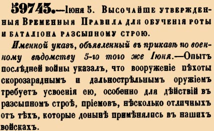 Именной указ, объявленный в приказе по военному ведомству 5-го того же Июня. Опыт последней войны указал, что вооружение пехоты скорозарядным и дальнострельным оружием требует усвоения ею, особенно для действий в разсыпном строе, приемов несколько отличных от тех, которые доныне применялись в наших войсках <…>